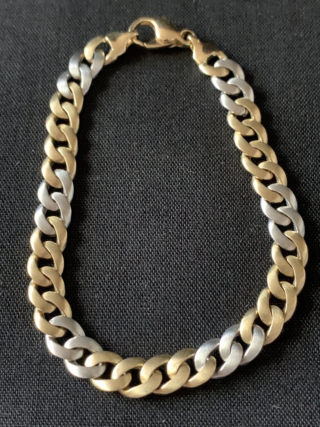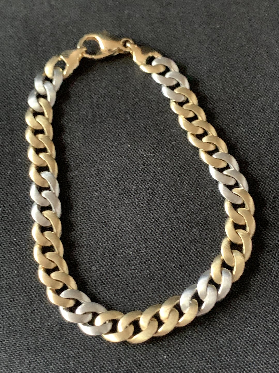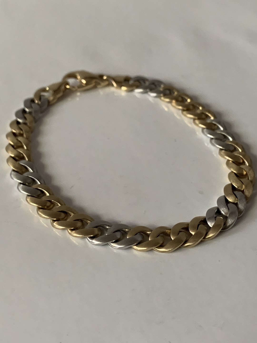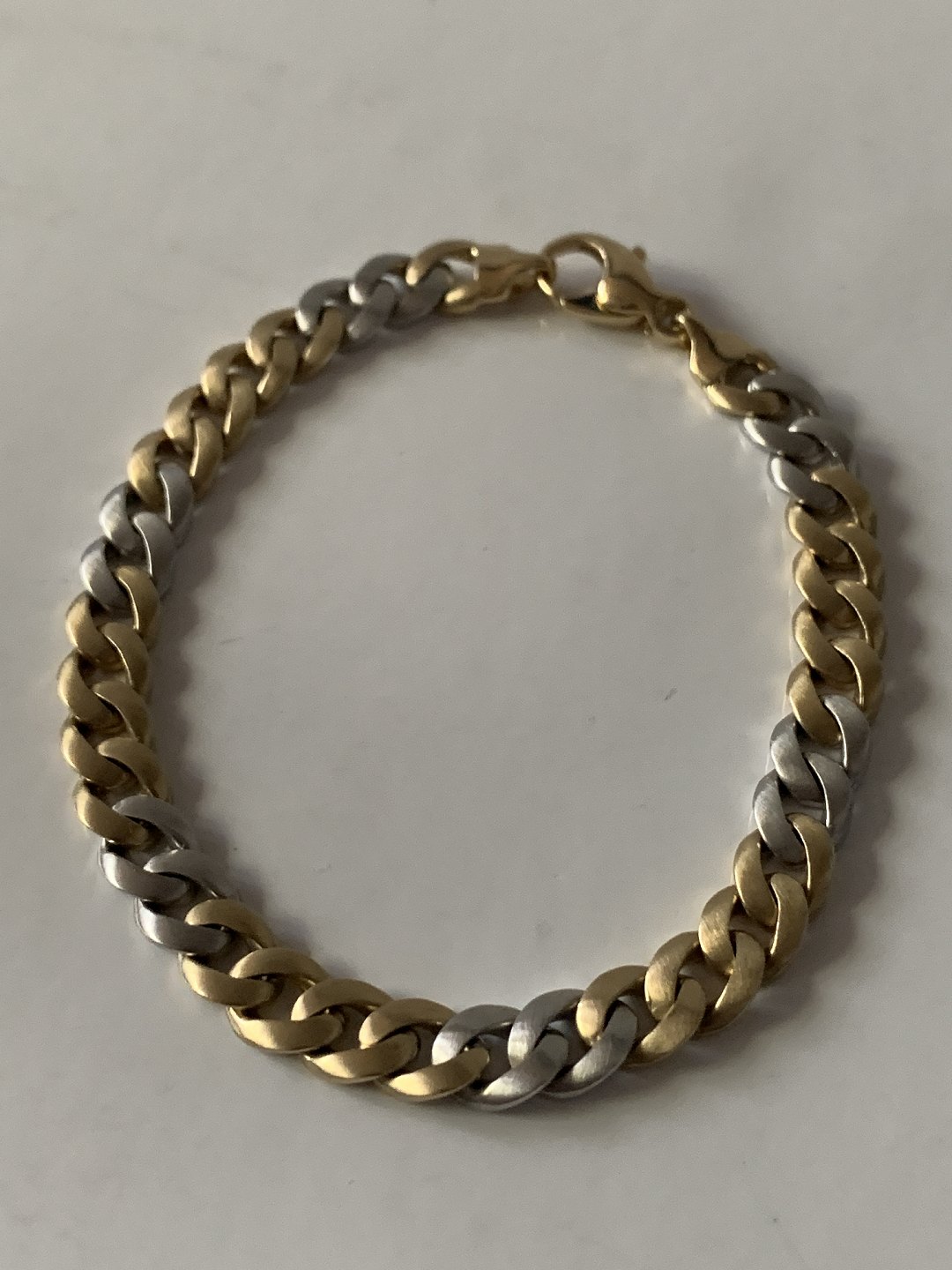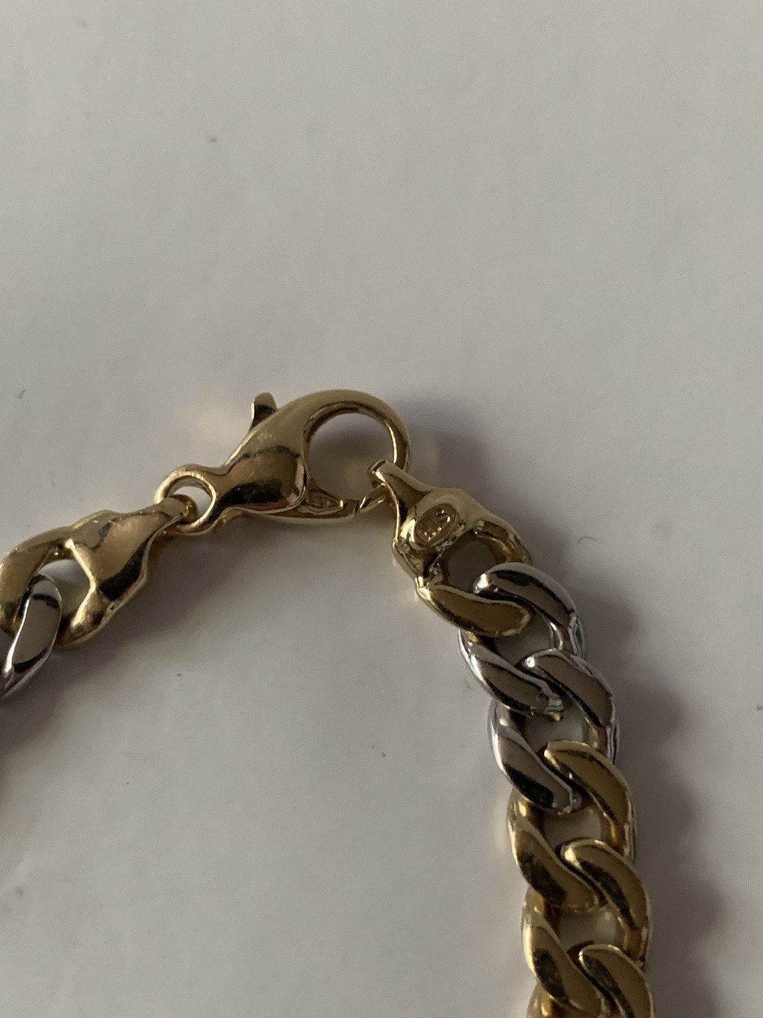 Very nice and elegant gold bracelet, in combined red and white gold. This combination gives the bracelet great dynamism and life when worn on the wrist. As an extra detail, the bracelet is polished on one side and brushed on the other. This enables two identities in the bracelet that can be combined with the outfit. A very beautiful bracelet that can be used for both everyday and festive occasions.