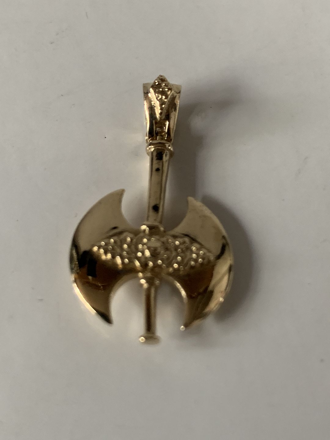 Pendant in 14 carat gold, designed as a double-edged axe, and with beautiful details and patterns. The pendant radiates great energy and strength. The pendant is made with many fine details, which will be fully expressed if you combine the pendant with a solid gold chain.