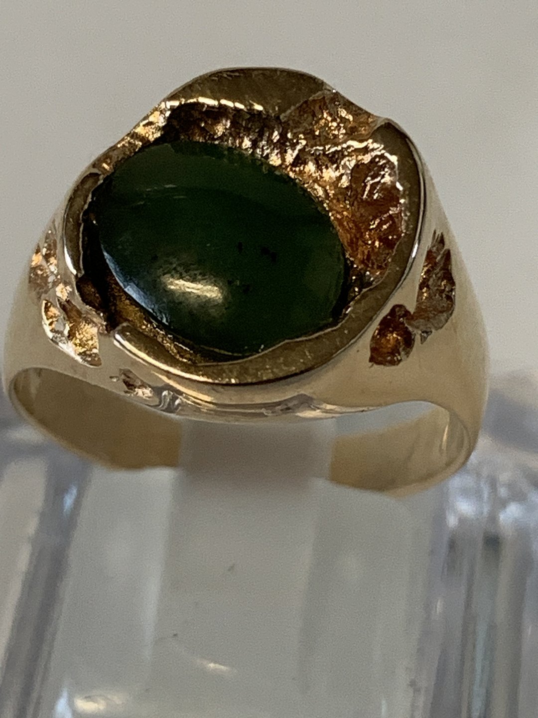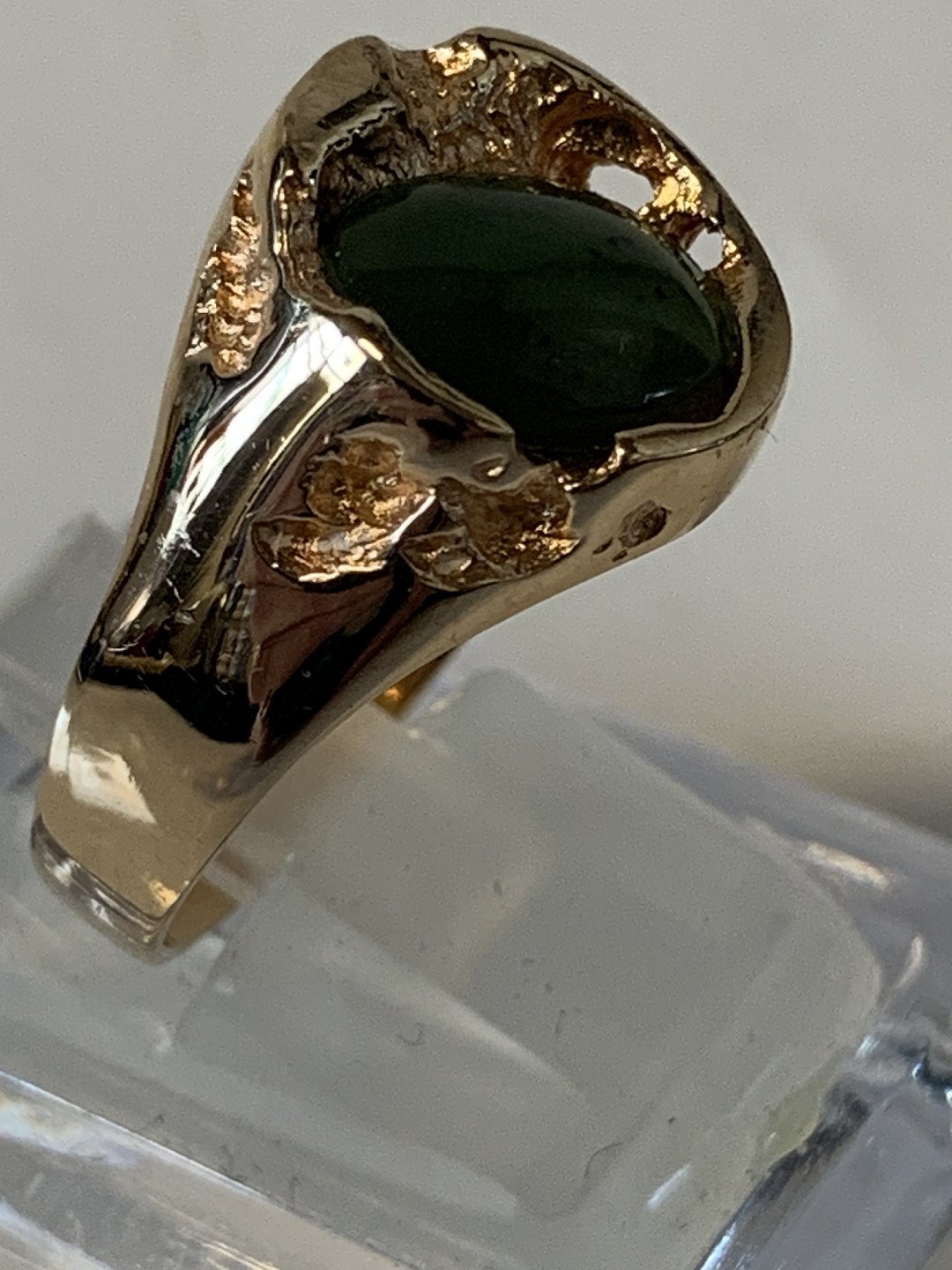 Beautiful men's ring with a completely unique design. The ring is forged with many beautiful details. The jade itself is immersed in the gold, which gives an incredibly beautiful 3-D effect, like a lake in a landscape. At the same time, the ring is made of solid gold, which gives the ring strength.