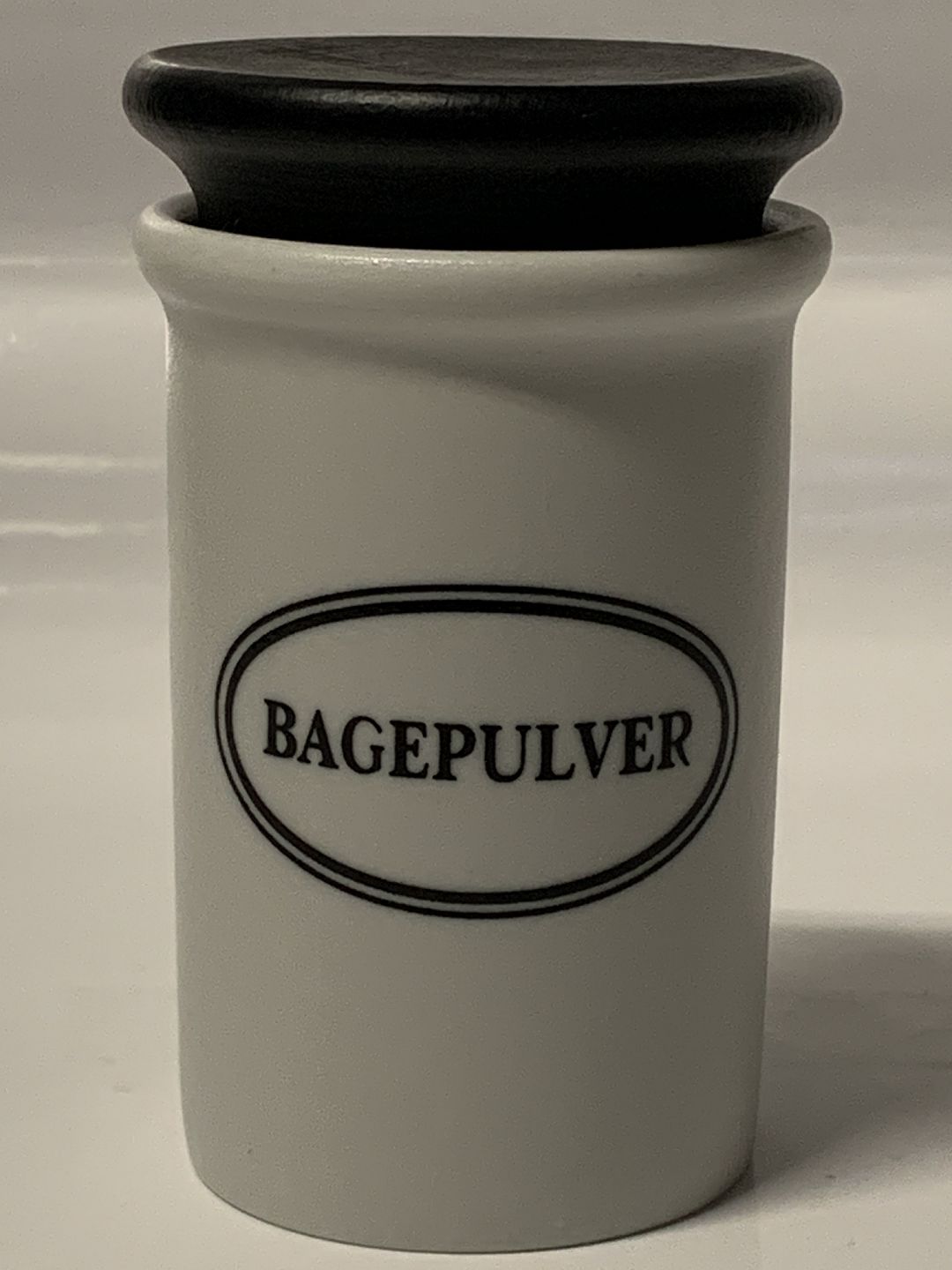 Eslau, Baking powder spice jar designed by Bjarne Bo. Matt glazed with black wooden lid, fits the Gourmet series.