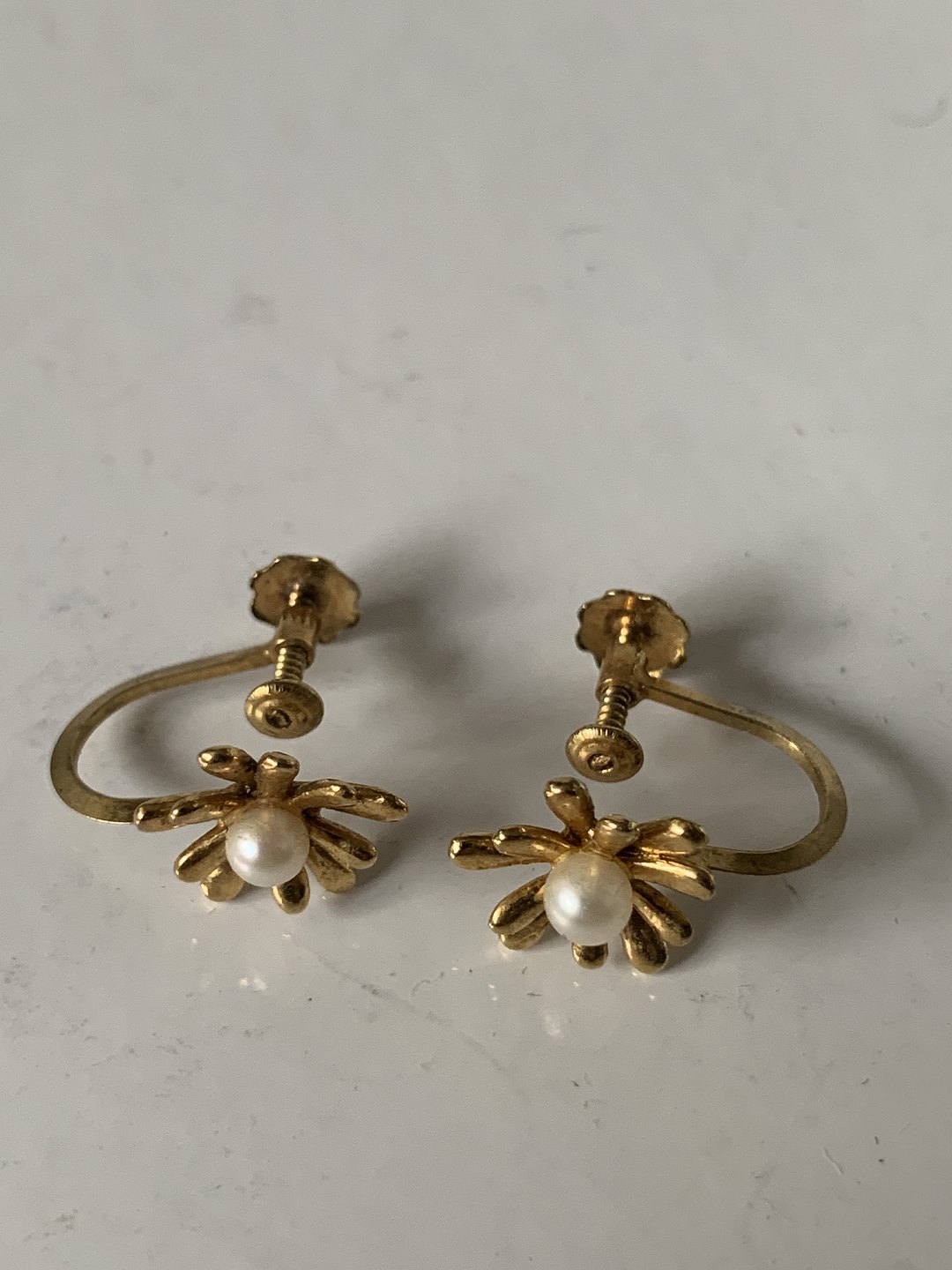 Perle, Øreringe med skrue 8K Guld Stemplet: HS HS Diameter: 1 cm. Flot og velholdt stand. Varen findes ikke fysisk i butikken. Kontakt os for fremvisning