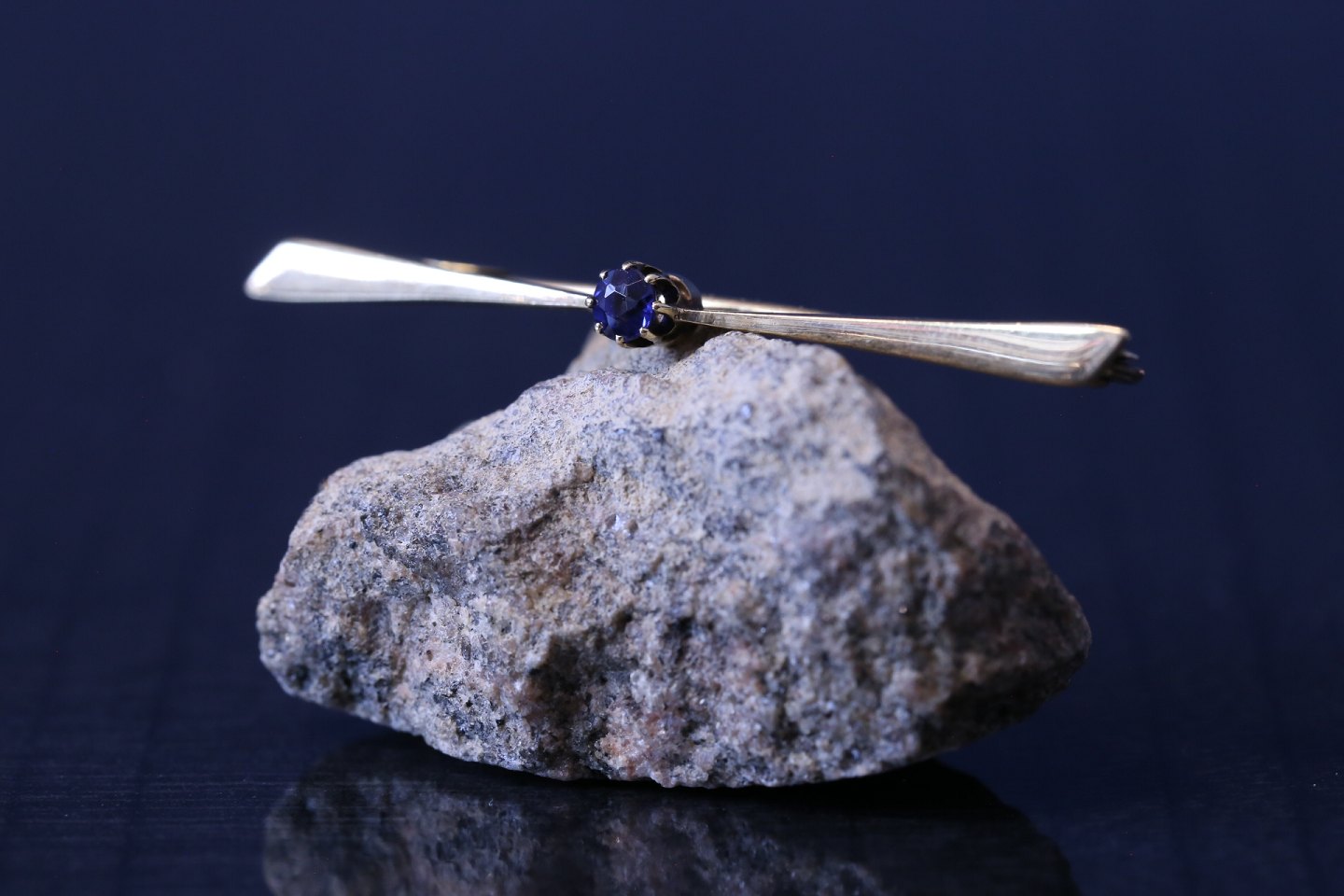 Guldbroche med facetslebet blå safir. 14 karat guld, stemplet 585