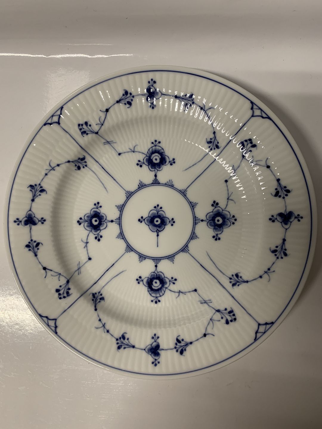 Royal Copenhagen Musselmalet Riflet, Middagstallerken. Dekorationsnummer 1/175. Diameter 25 cm. 1.sortering. Perfekt stand.