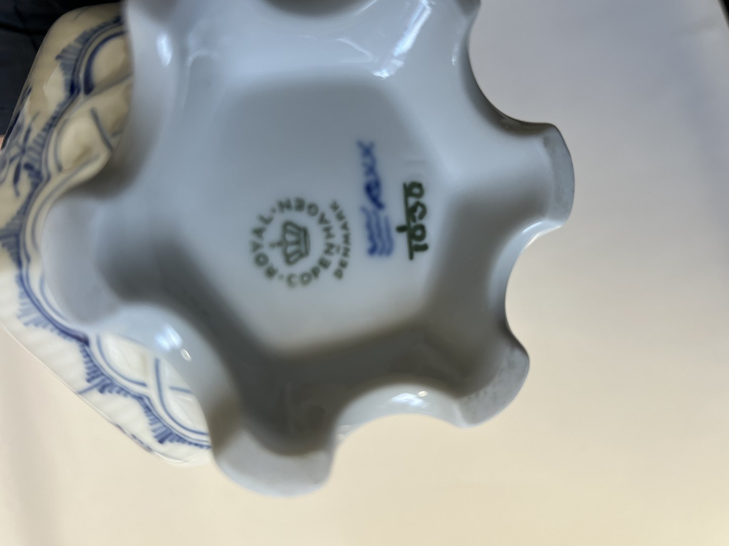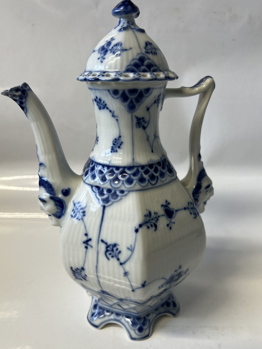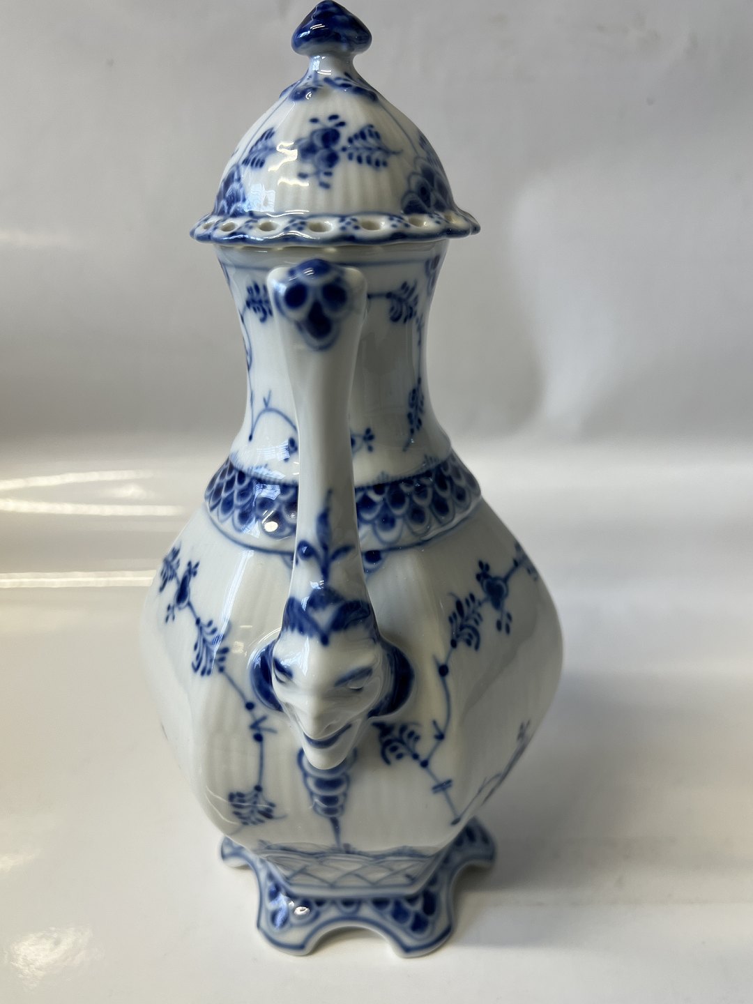 Royal Copenhagen Musselmalet Helblonde, lille kaffekande. Dekorationsnummer 1/1030. Denne er produceret i 1957. 1. sortering. Højde 21,0 cm. Perfekt stand uden fejl.