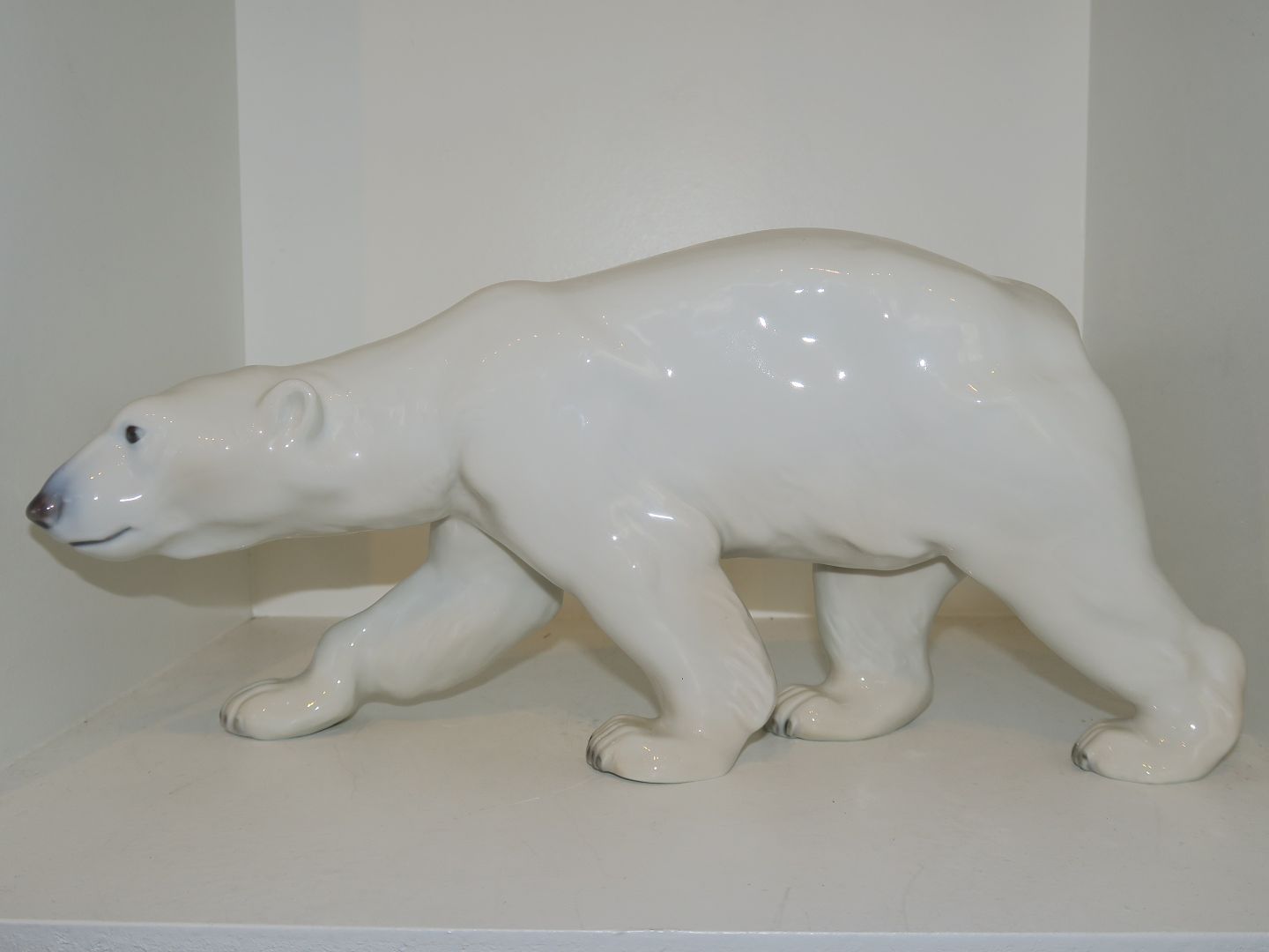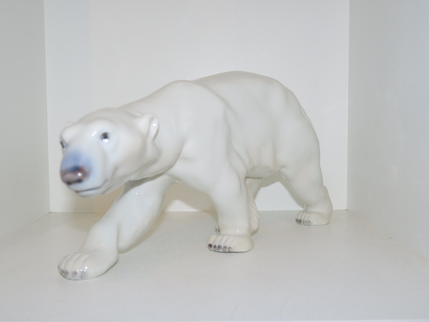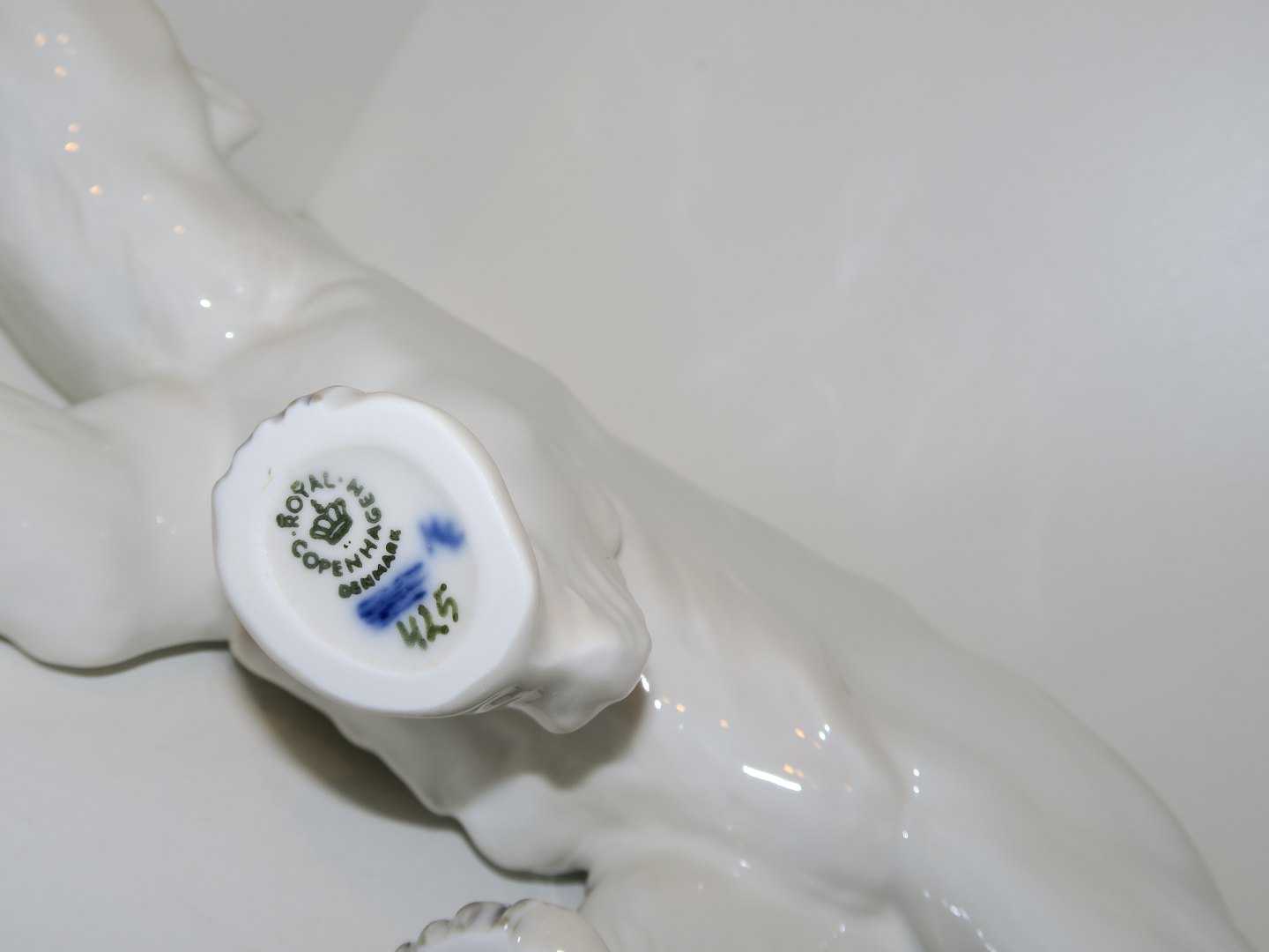 Stor Royal Copenhagen figur, isbjørn. Af fabriksmærket ses det, at denne er produceret i mellem 1992 og 1999. Dekorationsnummer 425. 1. sortering. Længde 30,5 cm. Perfekt stand uden fejl.