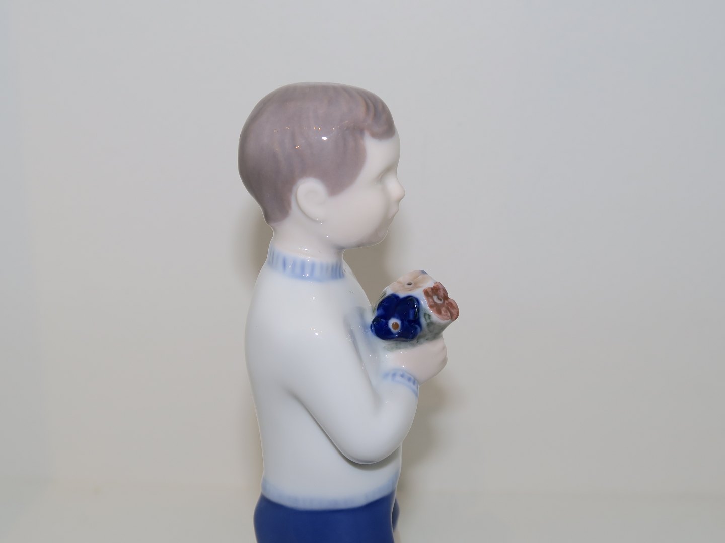 Bing & Grøndahl figur, dreng med blomsterbuket. Af fabriksmærket ses det, at denne er produceret mellem 1962 og 1970. Dekorationsnummer 2390. 1. sortering. Højde 17,6 cm. Perfekt stand uden fejl.