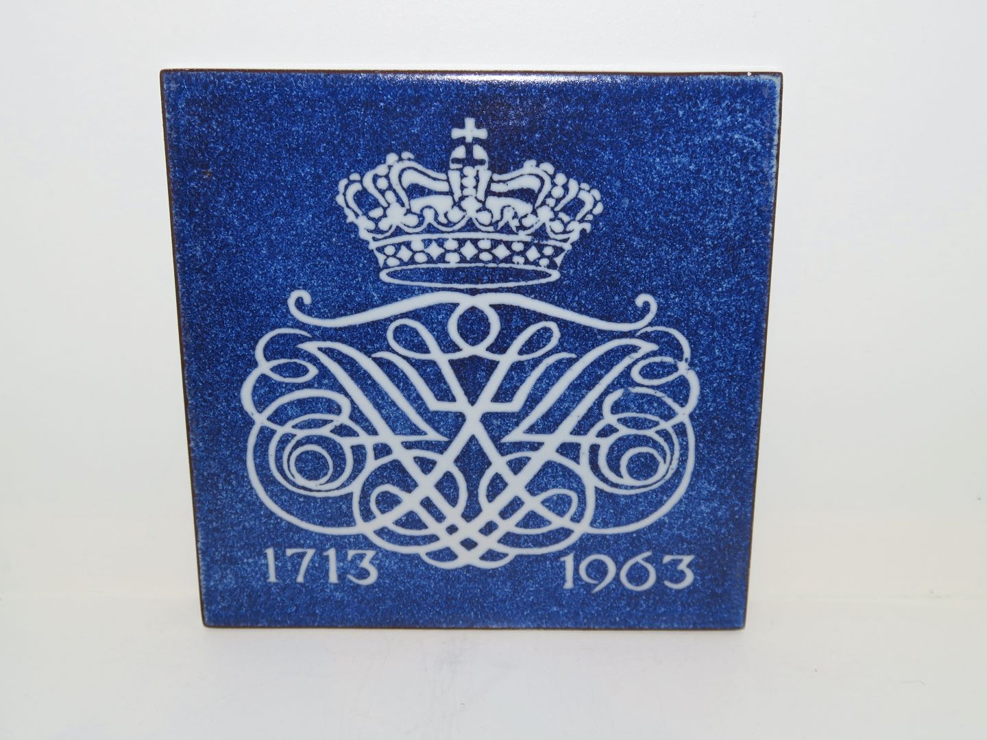 Aluminia Baca kakkel med monogram fra Hærens Officerskoles 250 års jubilæum 1713-1963.