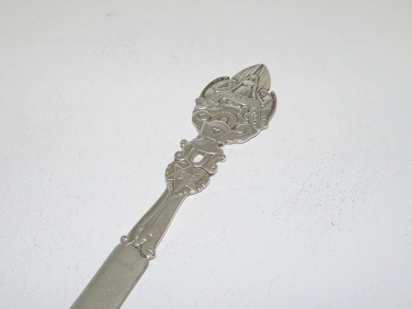 Anton Michelsen sølv, brevåbner fra Julen 1919 - "Fred paa jord". Længde 20,0 cm. Fin og velholdt stand.