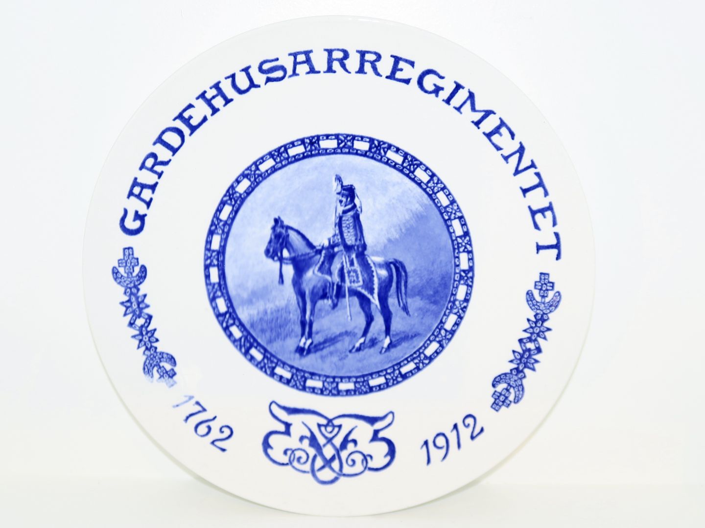 Aluminia Mindeplatte fra 1912 - Gardehusarregimenet 1772-1912. 1. sortering. Diameter 22,0 cm. Der er svage krakkeleringer i glasuren ellers perfekt stand uden fejl.