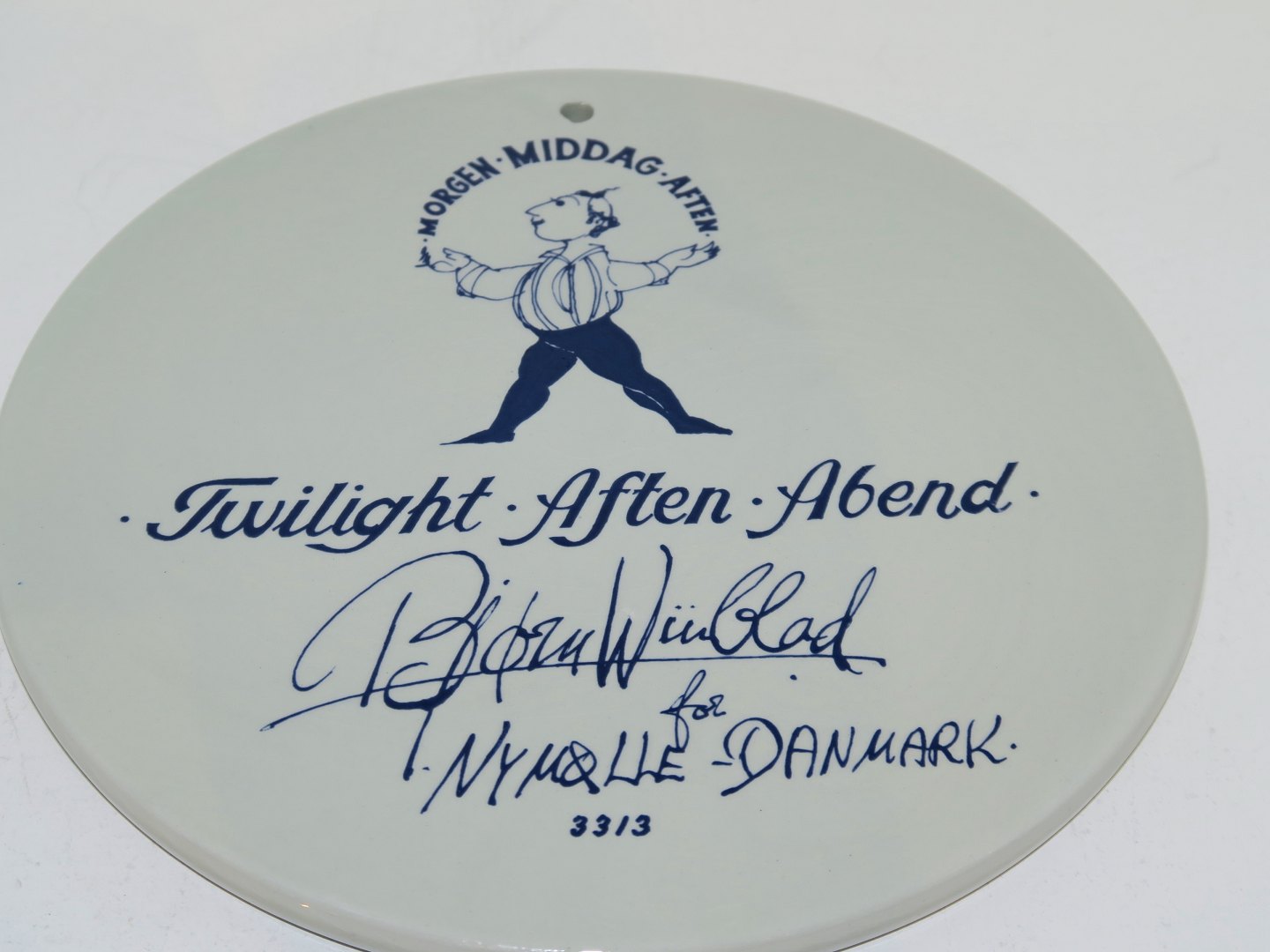 Nymølle keramik, Bjørn Wiinblad, blå smørbrik / platte med teksten Morgen Middag Aften. Denne er Aften. Dekorationsnummer 3313. Diameter 18,0 cm. Perfekt stand.