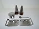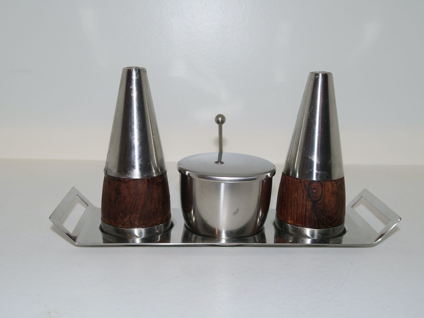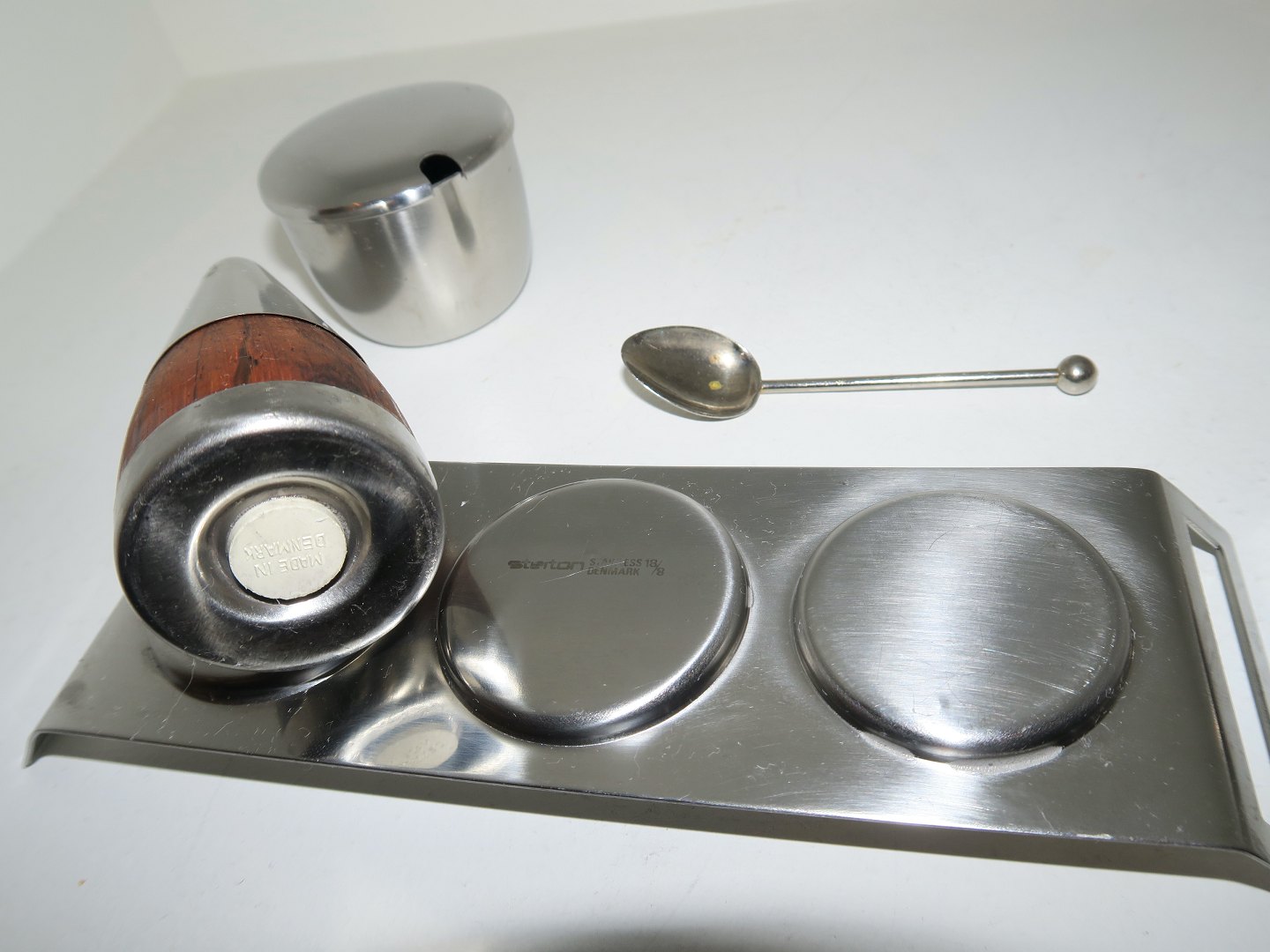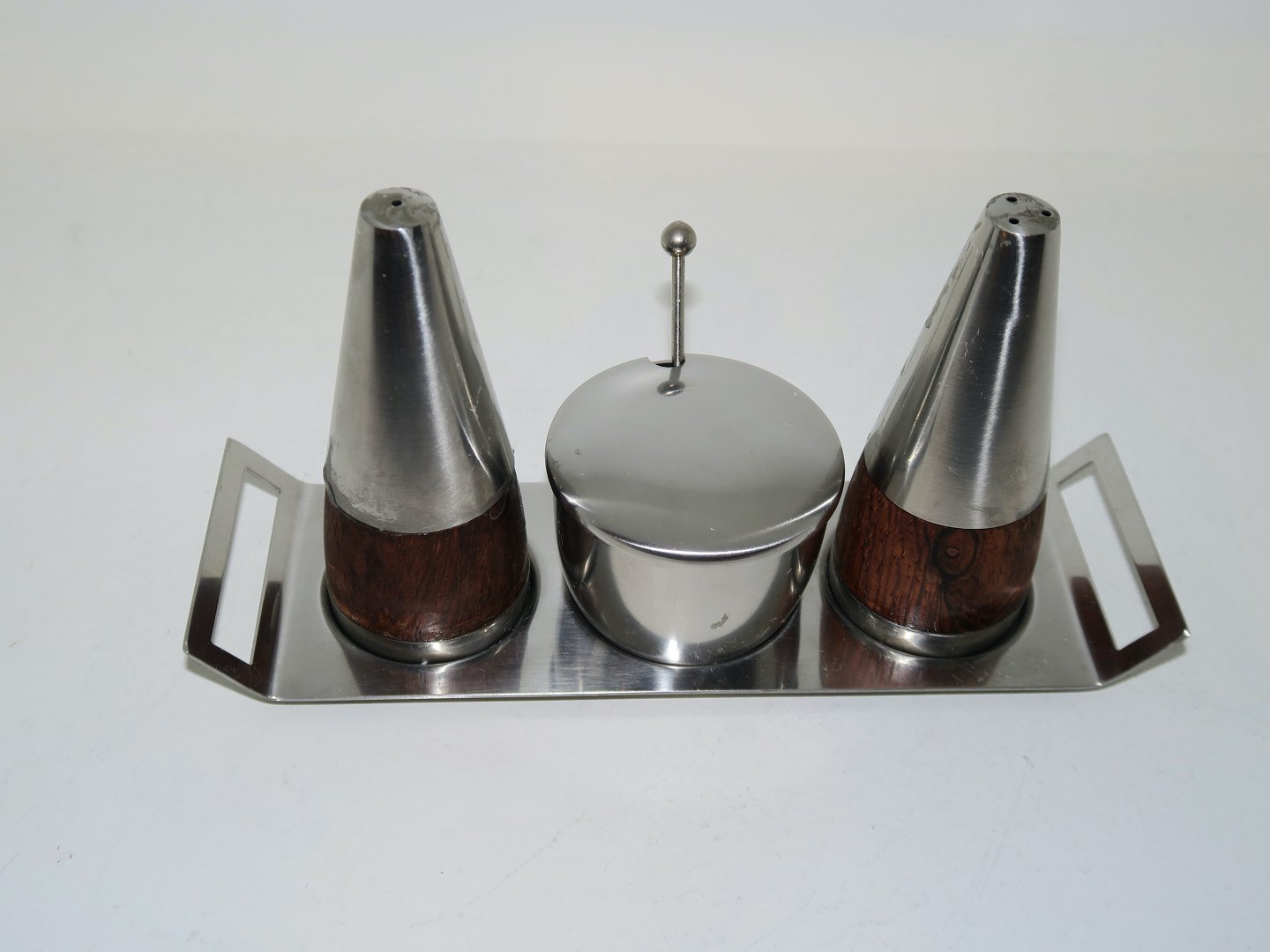 Stelton rustfrit stål og teaktræ, plat de menage med salt- og peberbøsse samt sennepskrukke. Længde 18,0 cm. Der er lidt lim rester på saltbøssen, se sidste billede ellers flot og velholdt stand.