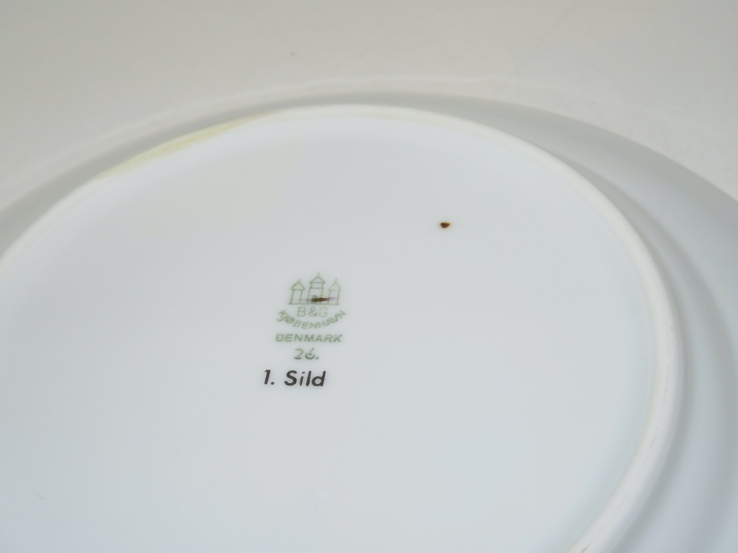 Bing & Grondahl Seagull with gold edge, fish plate number 1: Herring (Sild). Decoration number 26 or newer number 326. Factory second. Diameter 21.5 cm. Perfect condition with no chips, cracks or repairs.