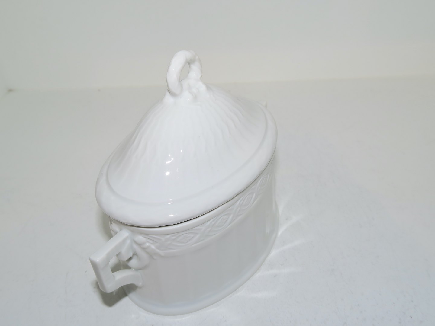 Royal Copenhagen White Fan, small sugar bowl. Designed by Arnold Krog in 1909. Decoration number 11561. Factory first. Length 12.7 cm. including handles. Perfect condition with no chips, cracks or repairs.