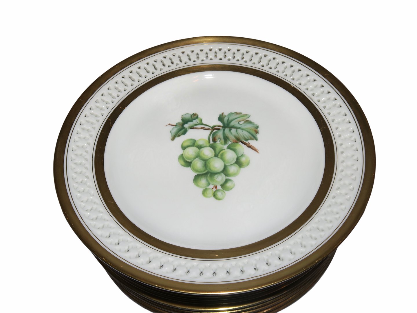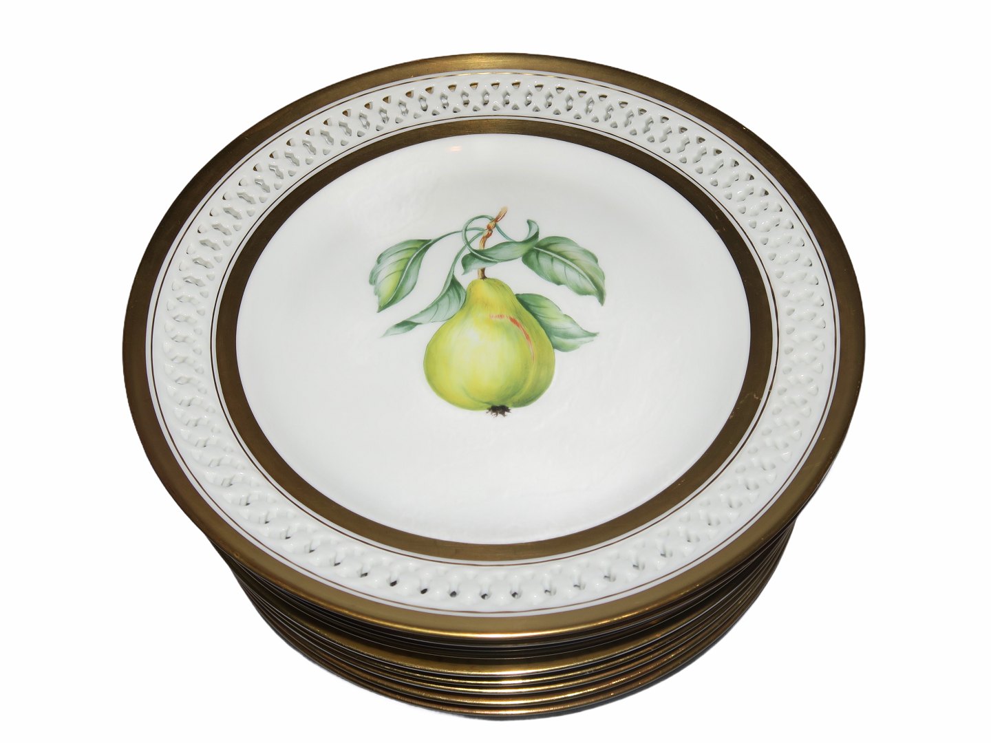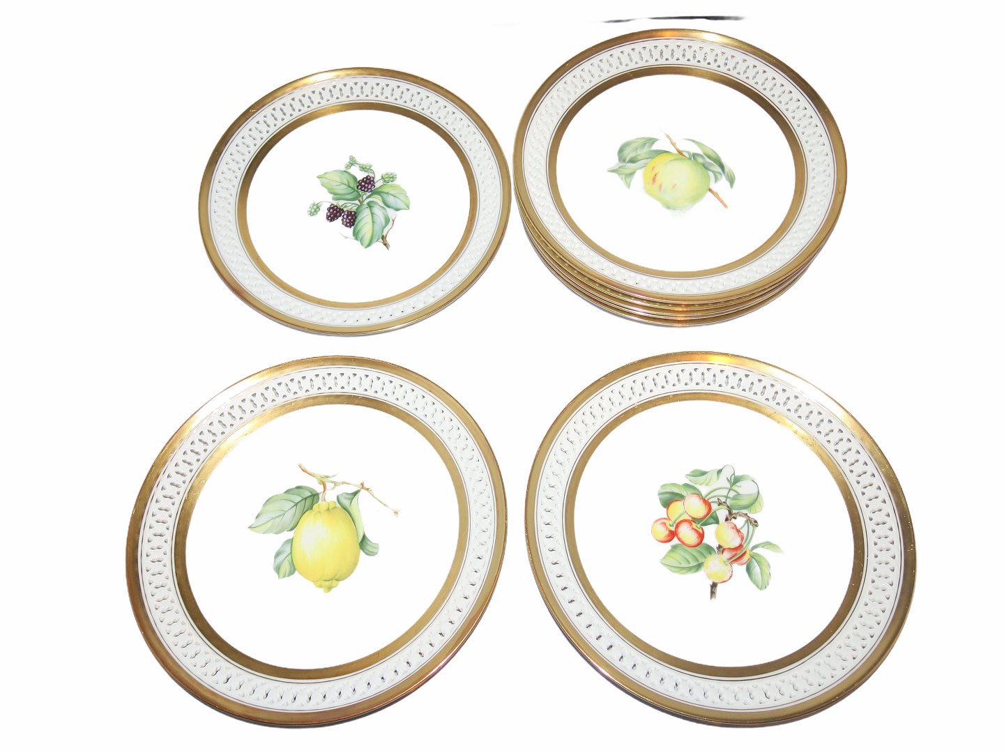Bing & Grondahl set of 11 plates with pierced borders decorated with different fruits in overglaze.