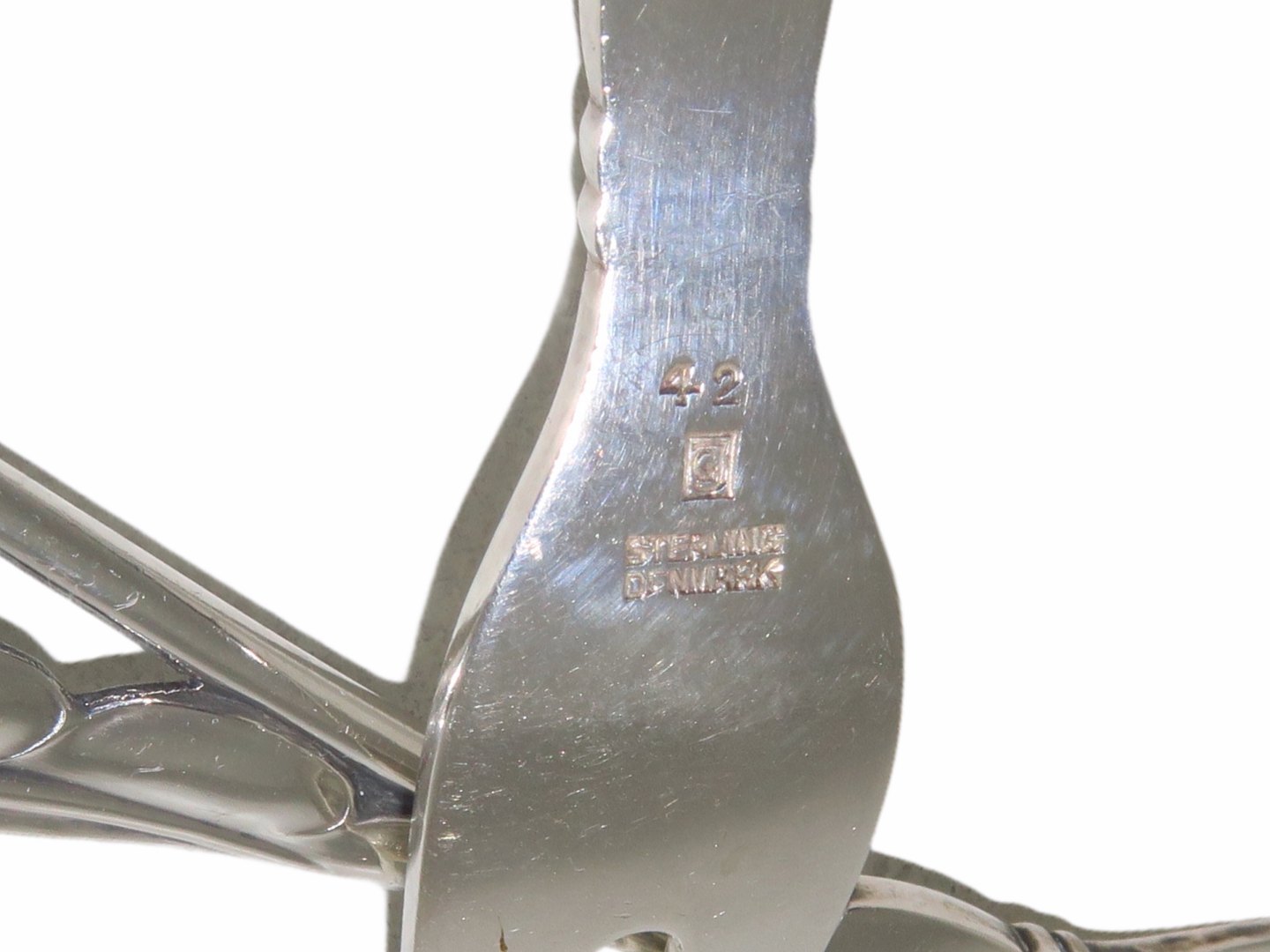 Georg Jensen Sterling sølv, ornamental pålægsgaffel. Designnummer 42. Denne er produceret i mellem 1933 og 1944. Længde 14,9 cm. Fin fejlfri stand uden indgraveringer.