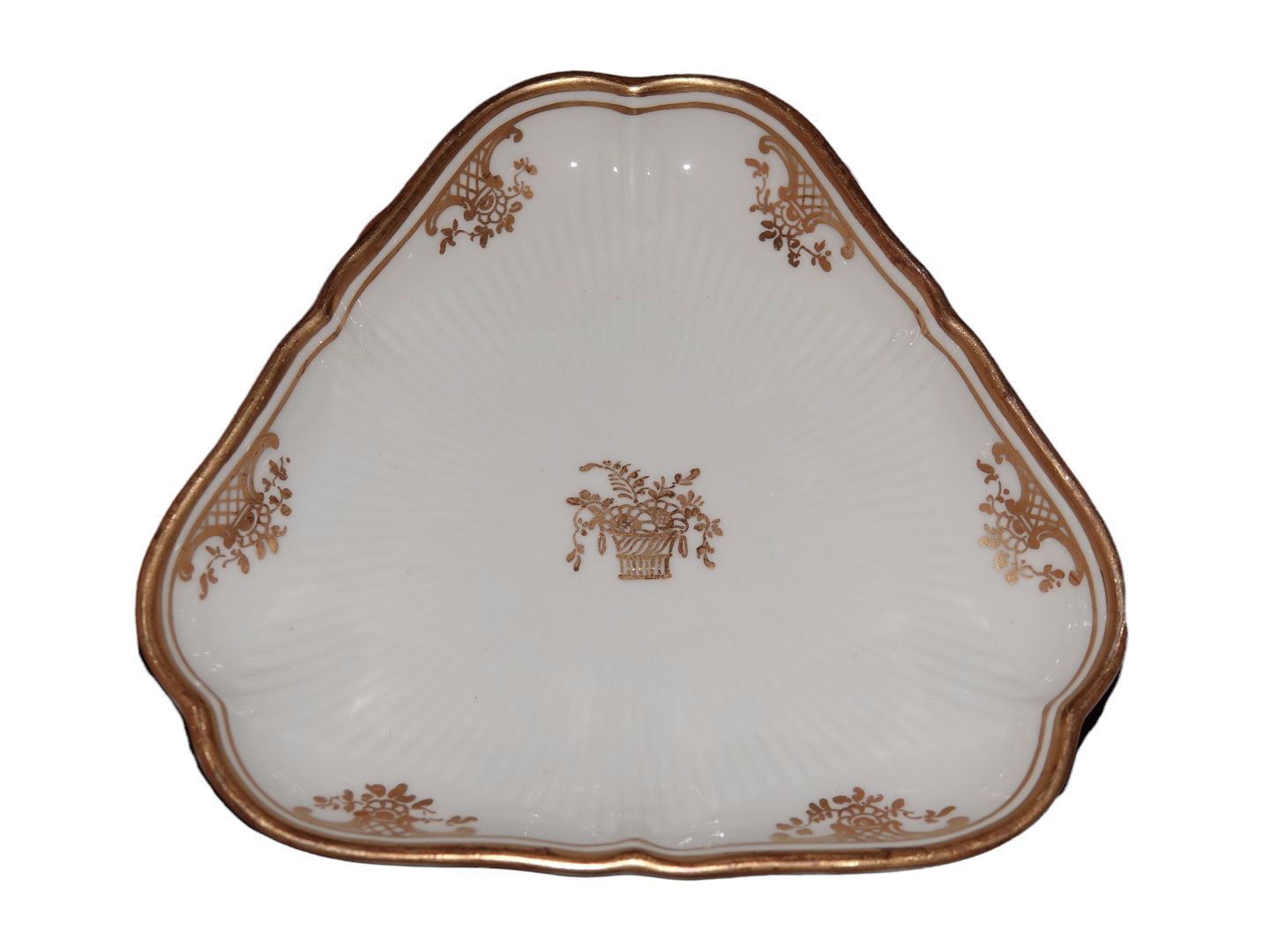 Royal Copenhagen Guldkurv med Ornamenter og Små Blomster, lille trekantet fad.