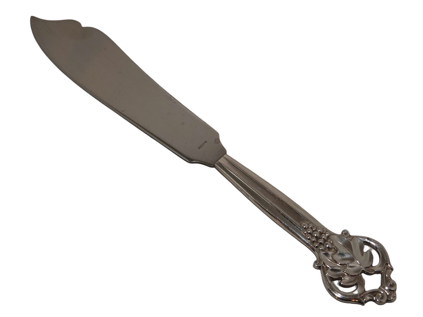 Dansk sølv og rustfrit stål, lagkagekniv. Stemplet med de Tre Tårne Længde 26,5 cm. Pæn stand uden indgraveringer.