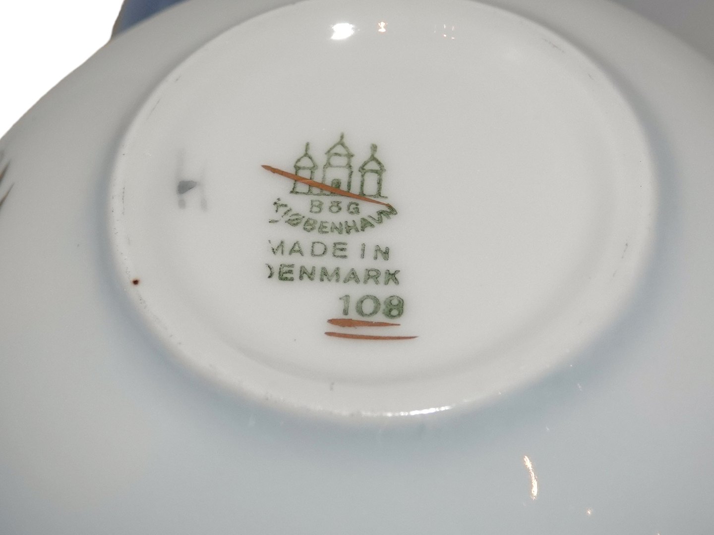 Bing & Grondahl Seagull with gold edge, tea cup with matching saucer. Decoration number 108. The cup measures 10.0 cm. across. Perfect condition with no chips, cracks or repairs.