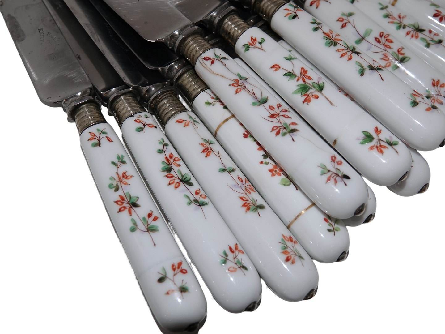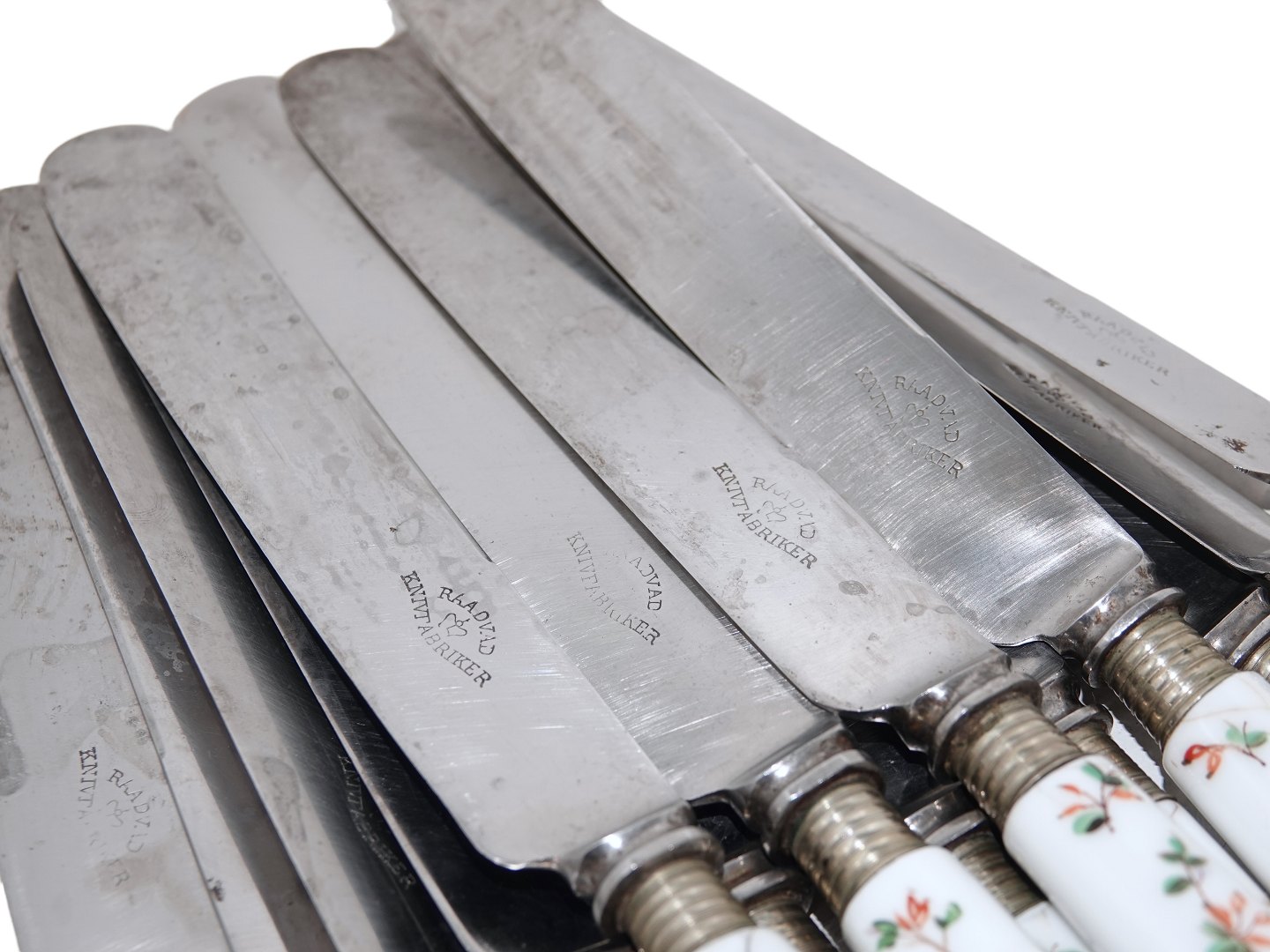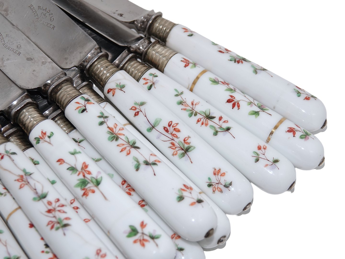 Royal Copenhagen Berberis, lang middagskniv med originalt Raadvad knivblad. Længde 26,5 cm., hvoraf bladet måler 15,7 cm. Alle knivene har revner og/eller skår på porcelænsskaftet, og der er lidt mærker på knivbladet.