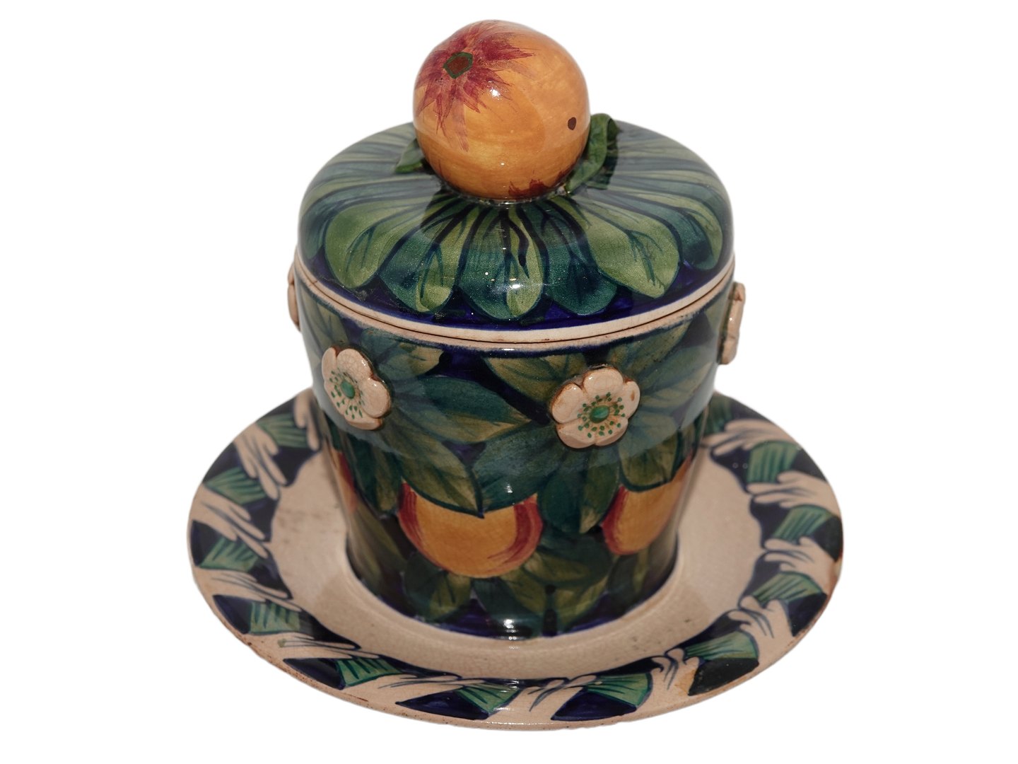 Der er en gammel reparation på låget og hele krukken er meget misfarvet. Se venligst fotos.