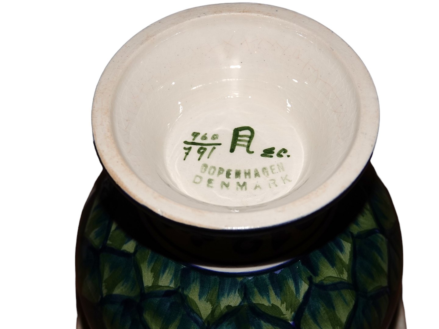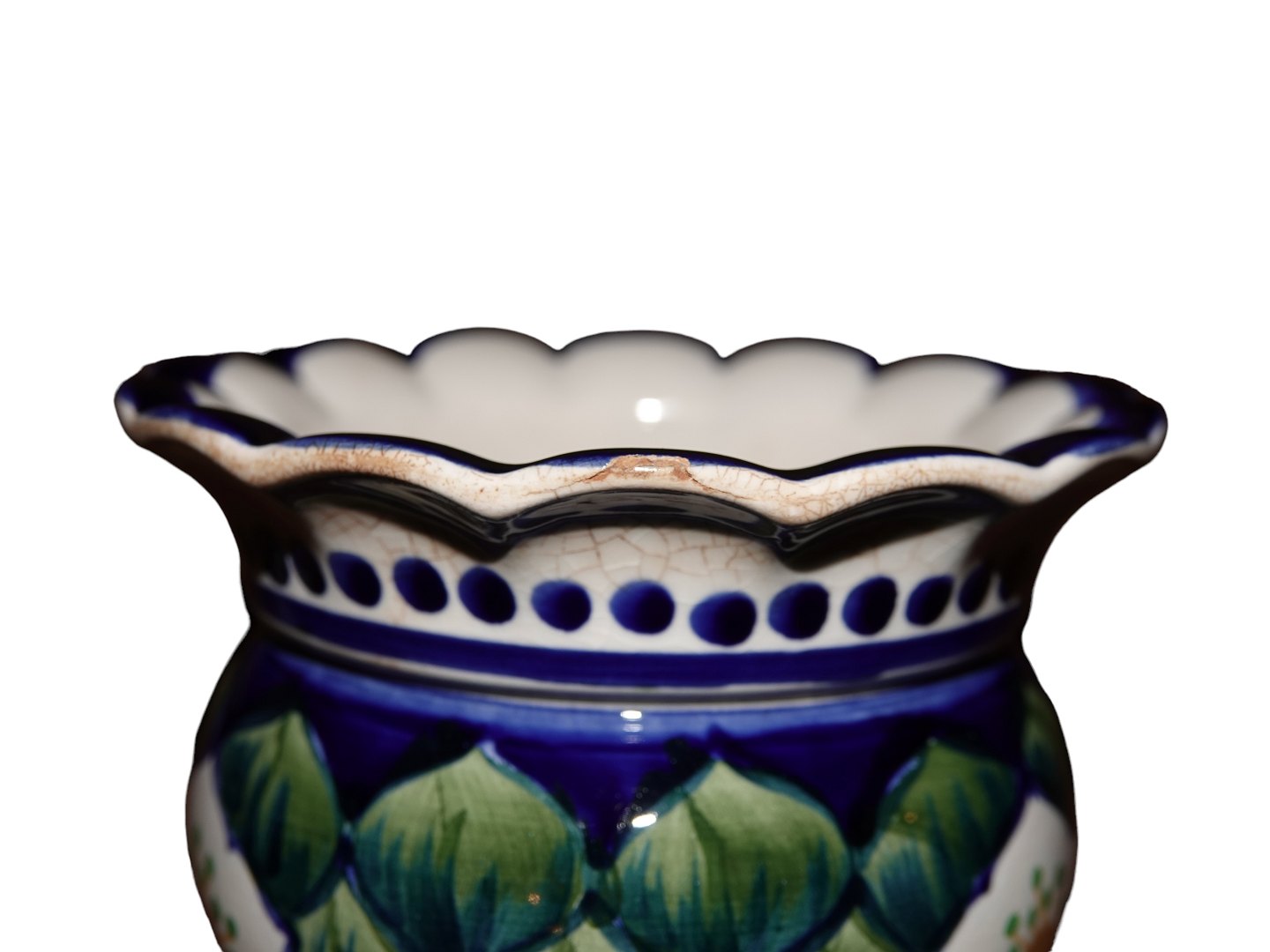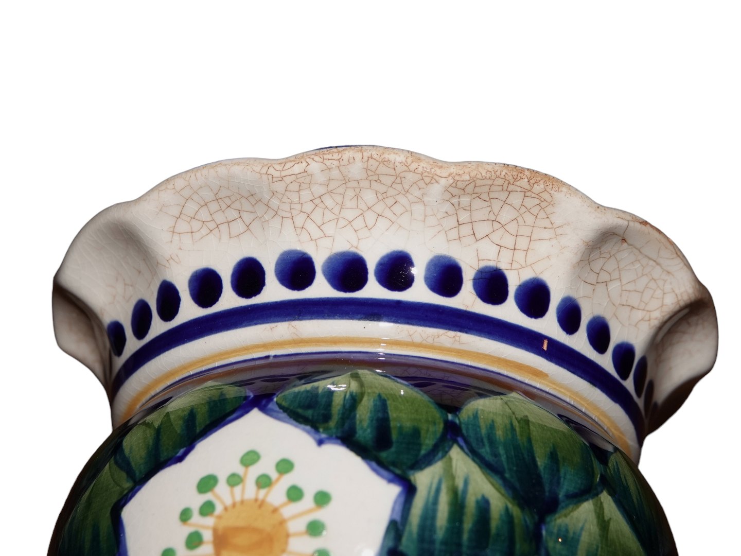 Der er et skår under topkanten samt misfarvninger i glasuren, se fotos, ellers in stand uden fejl.
