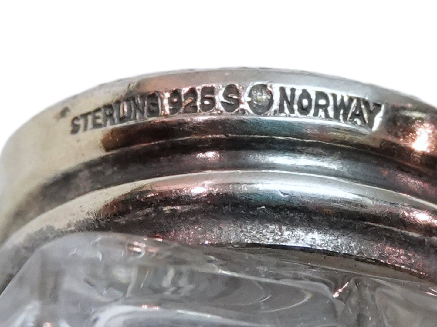 Norsk Saltbøsse og peberbøsse i krystalglas med låg af sterlingsølv og en flot emalje i lyserød og blå.