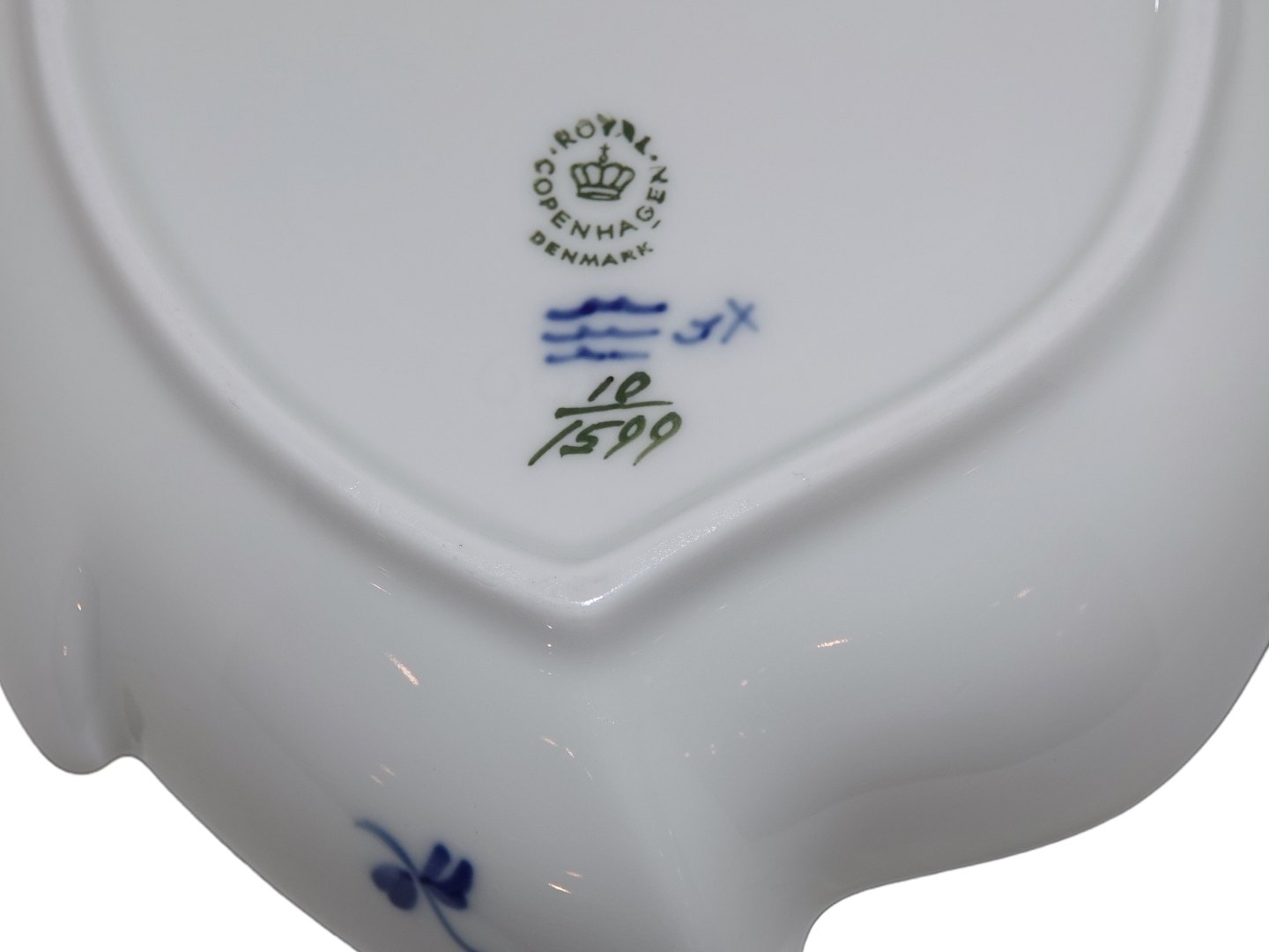Royal Copenhagen Blå Blomst Svejfet, kagefad. Af fabriksmærket kan det udledes, at denne er produceret i mellem 1969 og 1974. Dekorationsnummer 10/1599. 2. sortering. Længde 22,7 cm. Perfekt stand uden fejl.