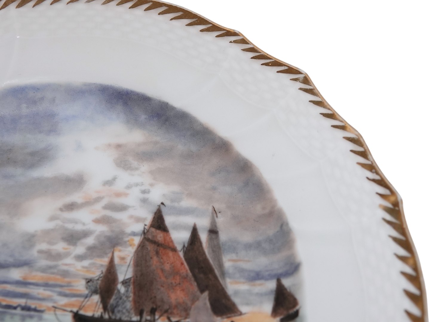 Royal Copenhagen Hvid Svejfet med takket guldkant, frokosttallerken dekoreret med skibe.