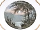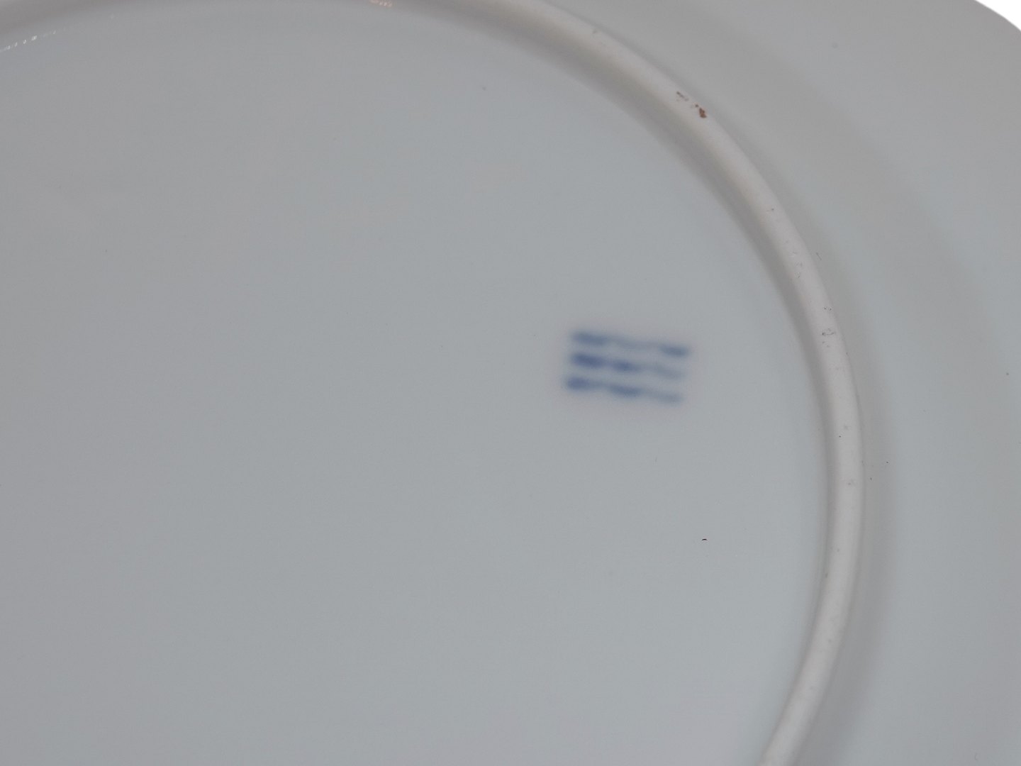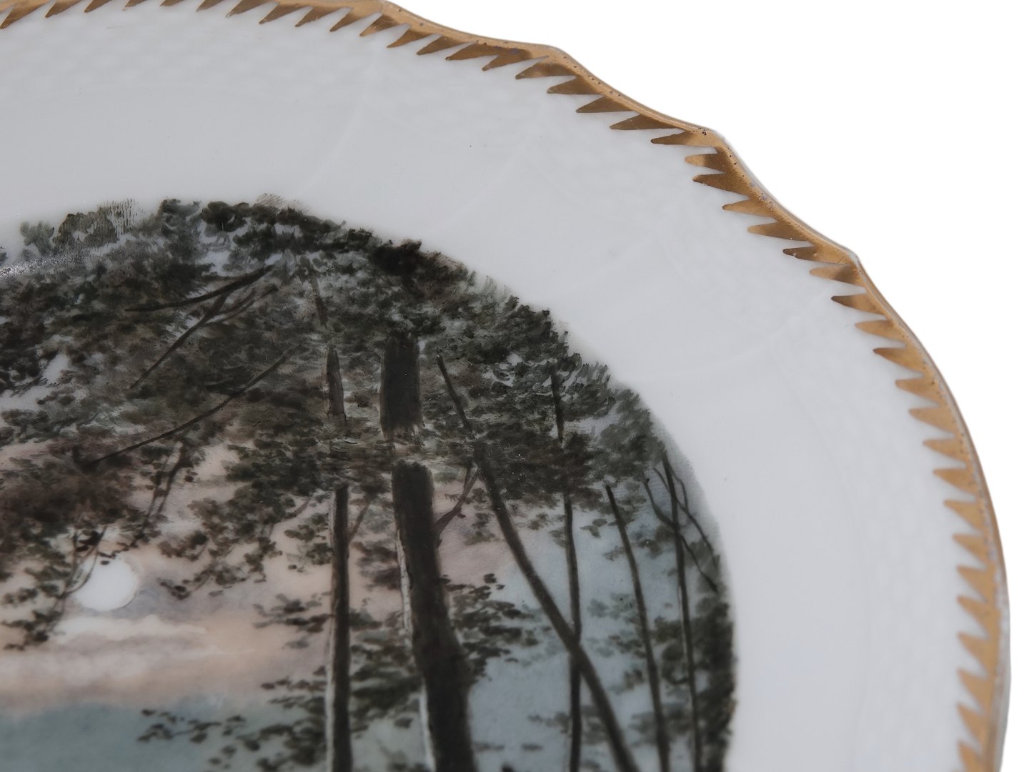 Royal Copenhagen Hvid Svejfet med takket guldkant, frokosttallerken dekoreret med landskab.