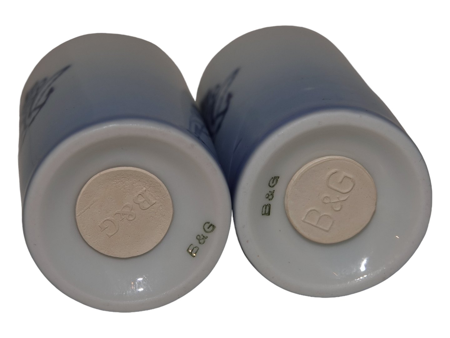 Bing & Grøndahl Blå Tone Jernporcelæn, saltbøsse og peberbøsse med logo. 1. sortering. Højde 7,0 cm. Perfekt stand uden fejl. Prisen er for begge.