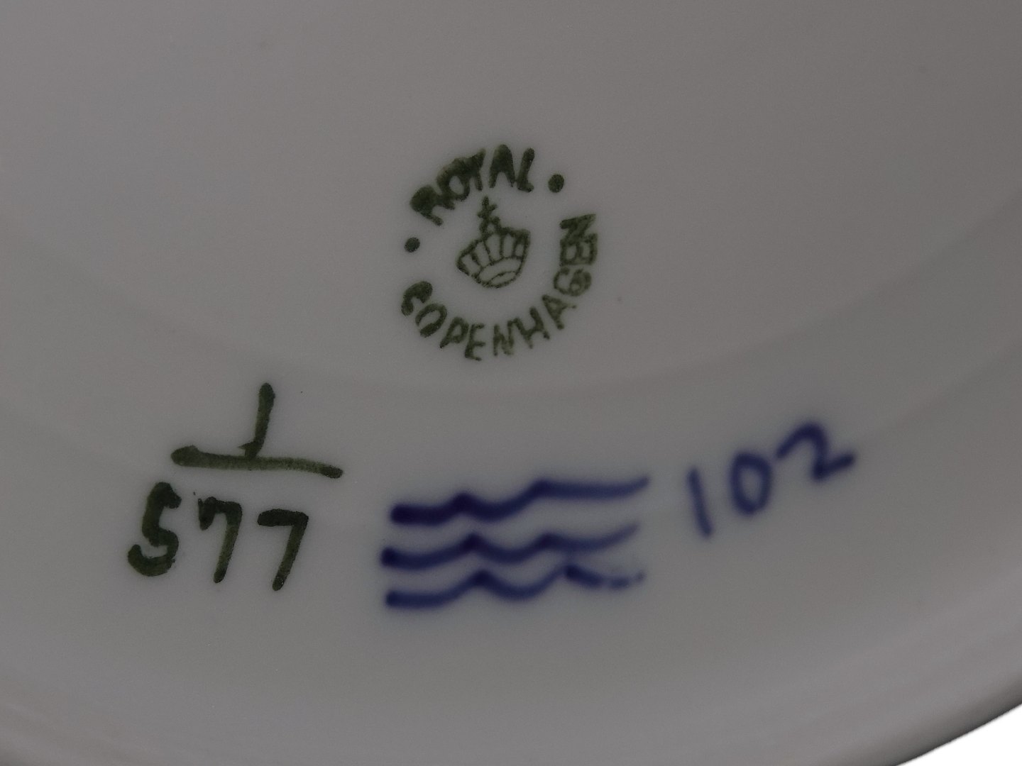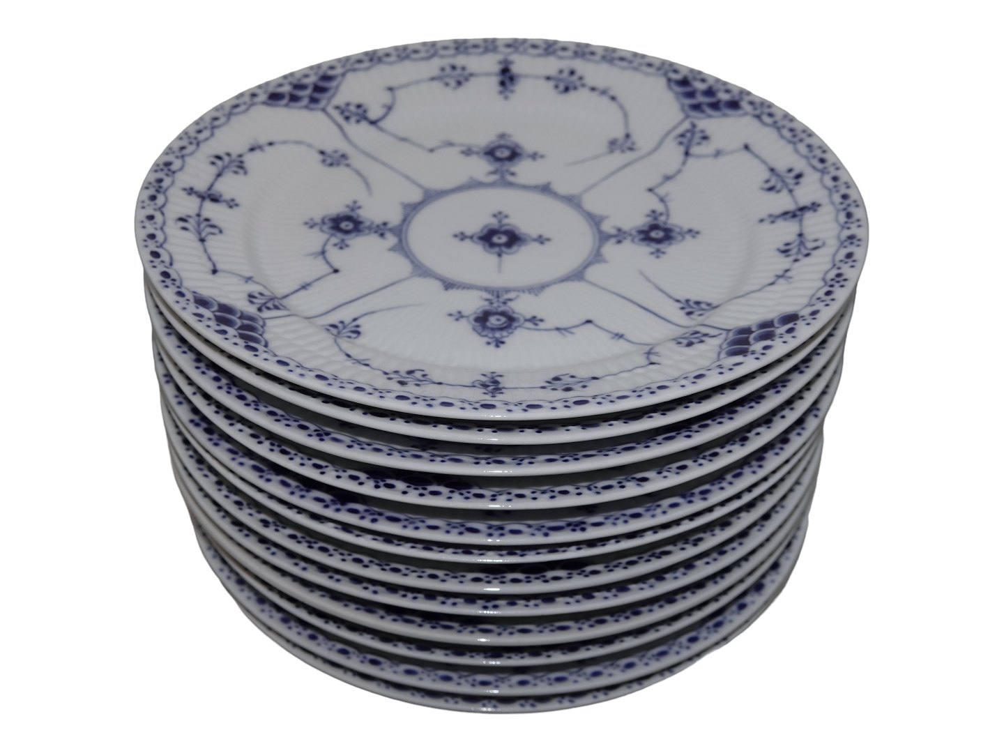 Royal Copenhagen Musselmalet Halvblonde, Helflad middagstallerken. Dekorationsnummer 1/577. Disse er alle produceret mellem 1898 og 1923. 1. sortering. Diameter 24,5 cm. Perfekt stand uden fejl.