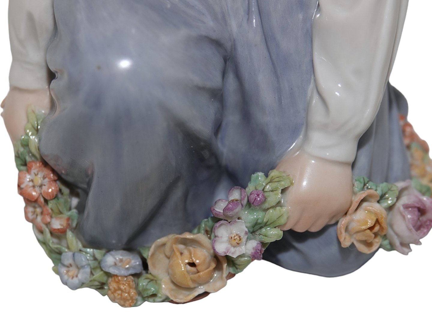 Royal Copenhagen overglasur figur, dreng i egnsdragt fra Amager med lang blomsterkrans.