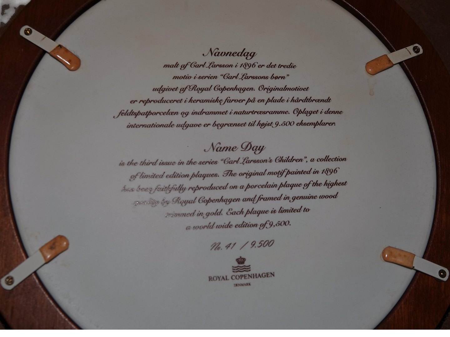 Royal Copenhagen Carl Larsson platte i mørk træramme, Navnedag.