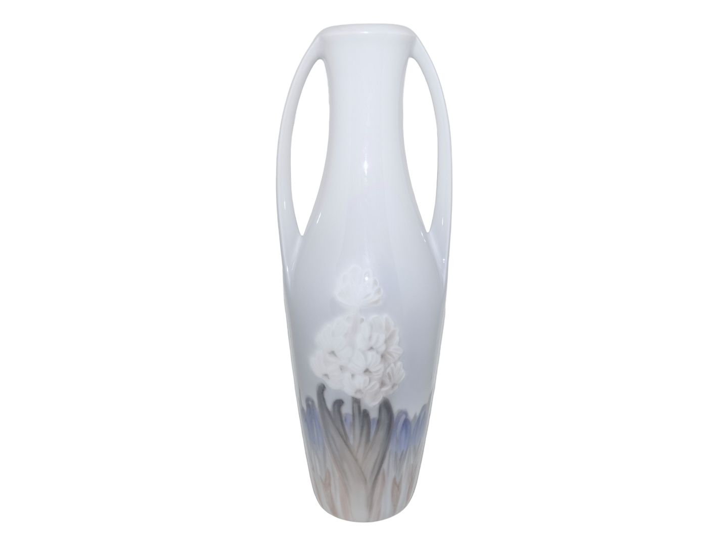 Royal Copenhagen Art Nouveau, høj vase med to hanke. Af fabriksmærket ses det, at denne er produceret mellem 1923 og 1928. Dekorationsnummer 2003/249. 2. sortering. Højde 31,0 cm. Perfekt stand uden fejl.