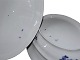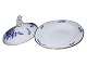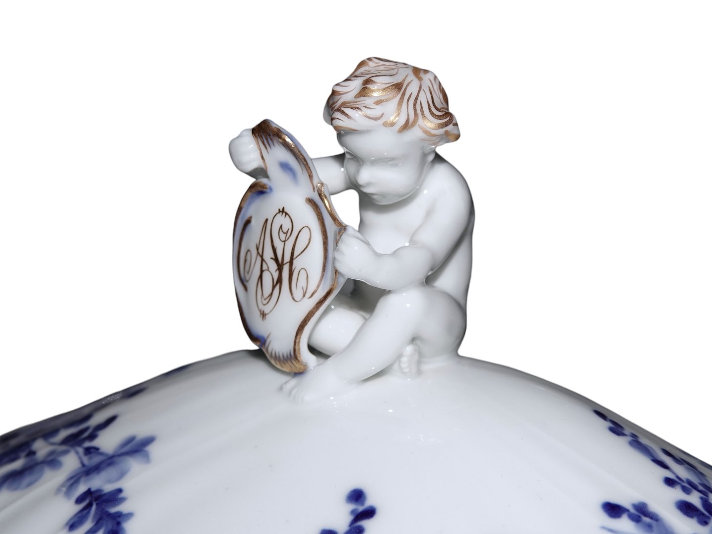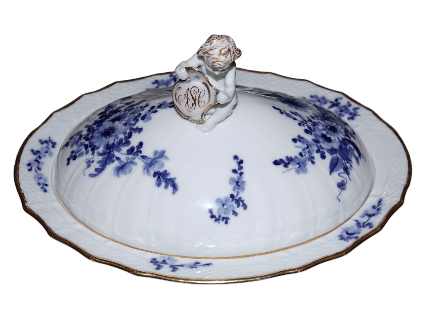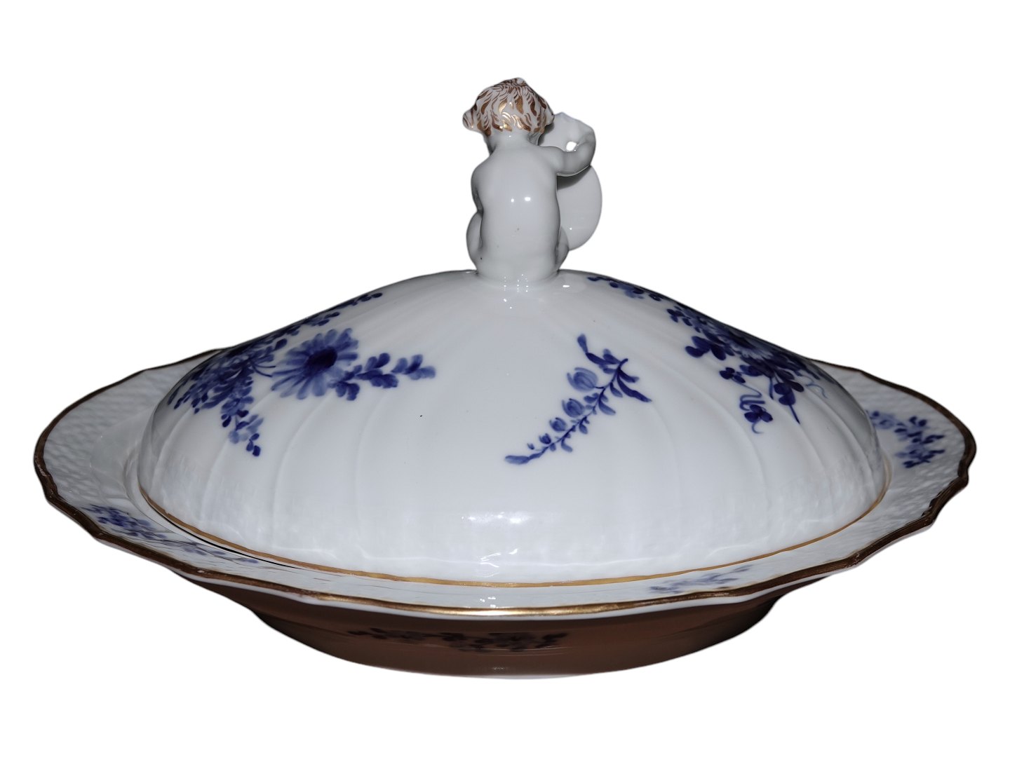 Royal Copenhagen Blå Blomst Svejfet med guldkant, sjælden skål med låg med figur af dreng (putti).
