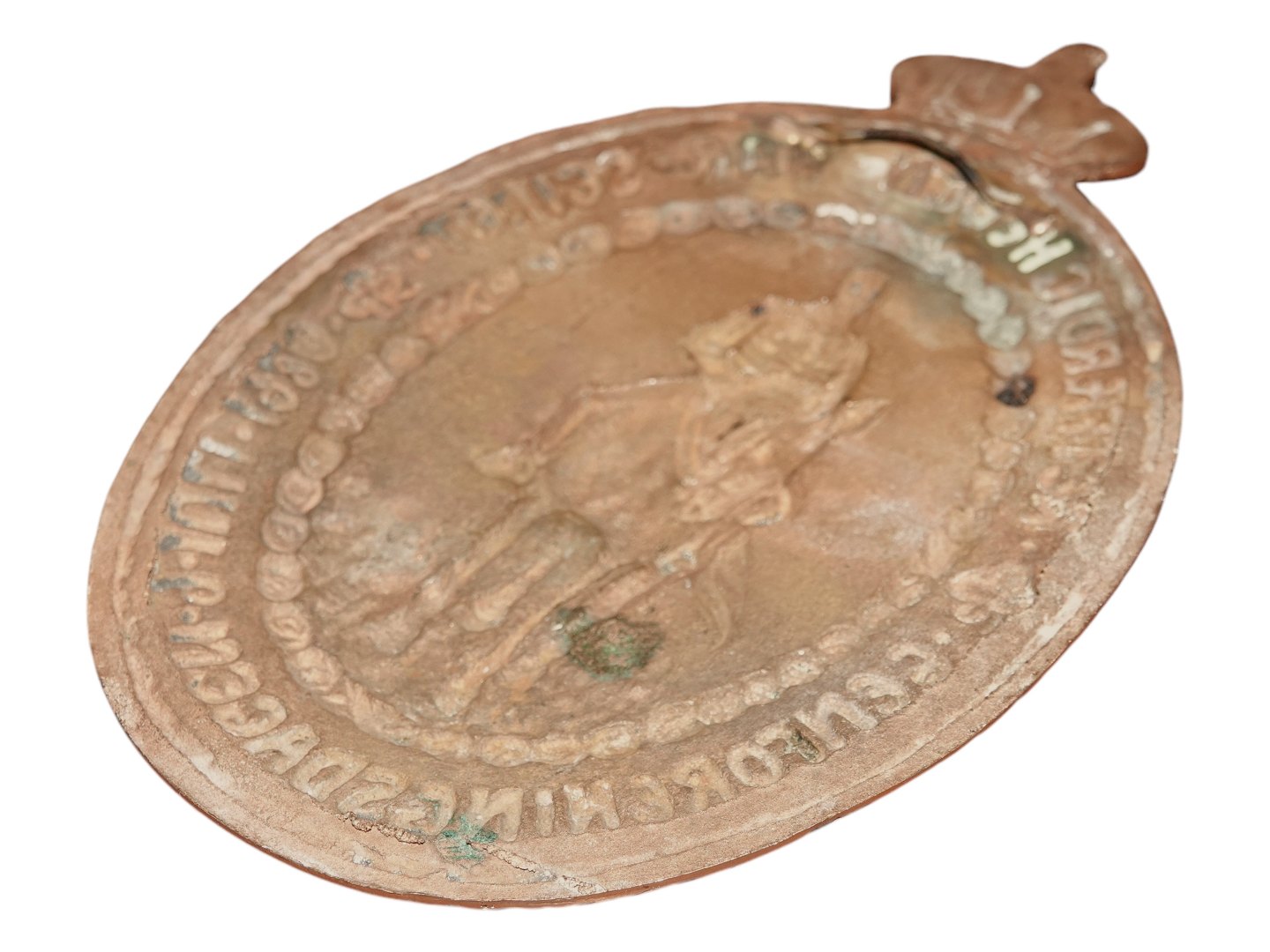 Fin, tung platte i messing med teksten: GENORENINGSDAGEN 9 JULI 1920 - RETFÆRDIGHENDEN HAR SEIRET.