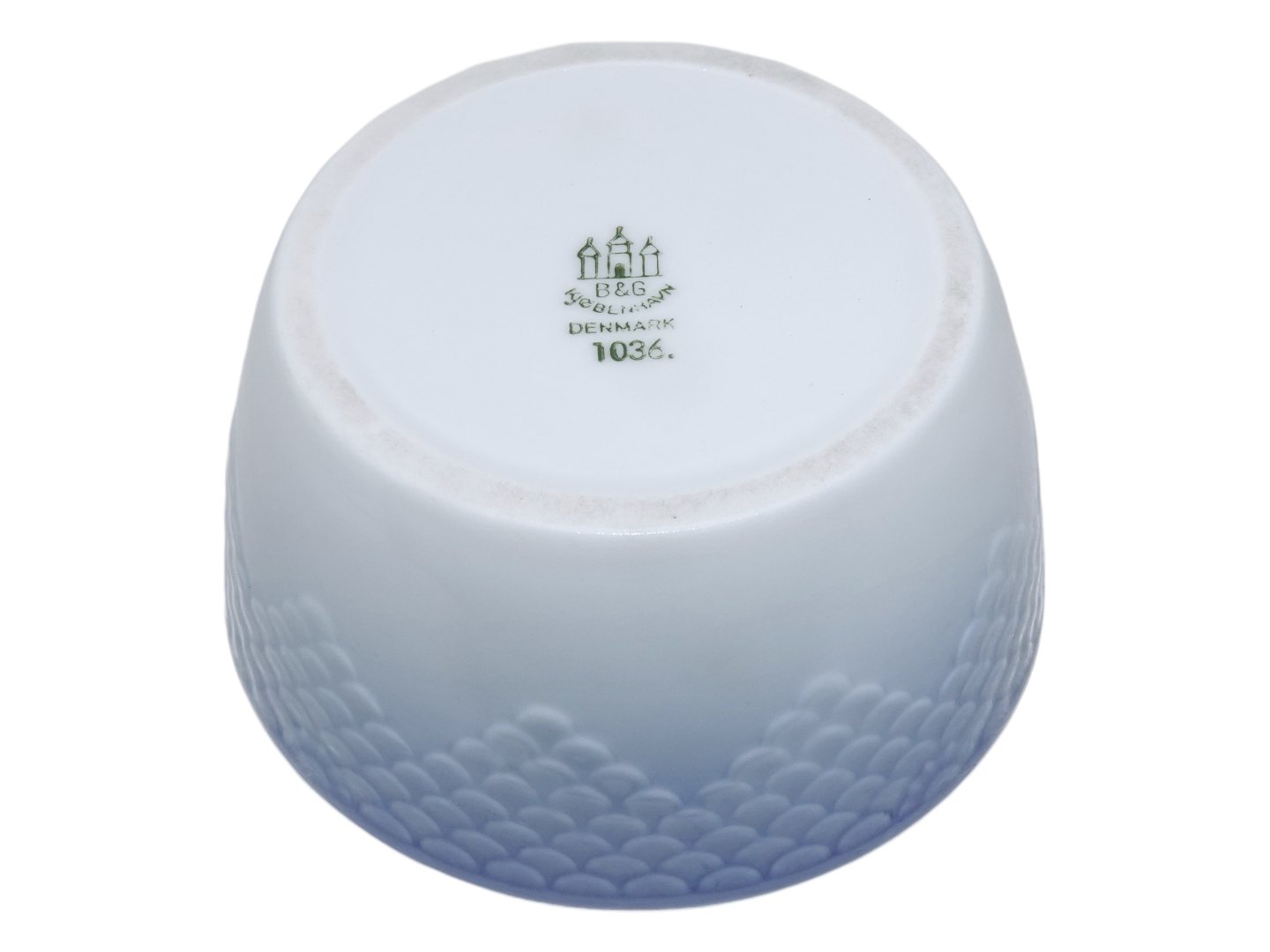 Bing & Grøndahl Blå Tone også kaldet Musling. (Mågestel uden måger), sukkerskål. Tykt jernporcelæn. Dekorationsnummer 1036. 1. sortering. Diameter 8,8 cm. Perfekt stand uden fejl.