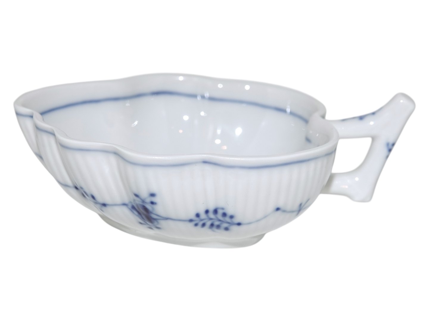 Royal Copenhagen Musselmalet Riflet, skål med grenhank - stor model. 1. sortering. Længde 14,0 cm. med hank og 10,5 cm. uden hank. Bredde 9,8 cm. Perfekt stand uden fejl.