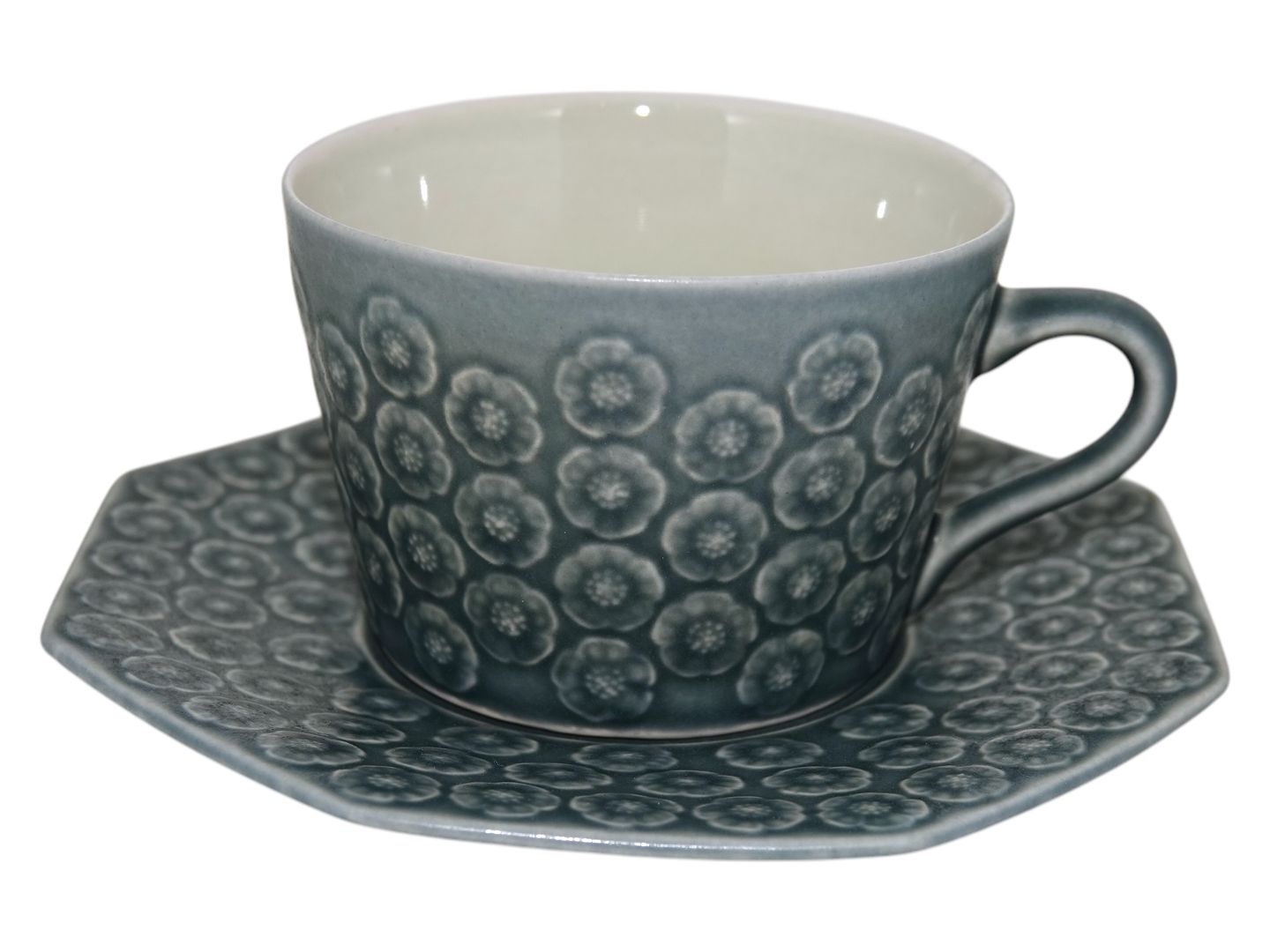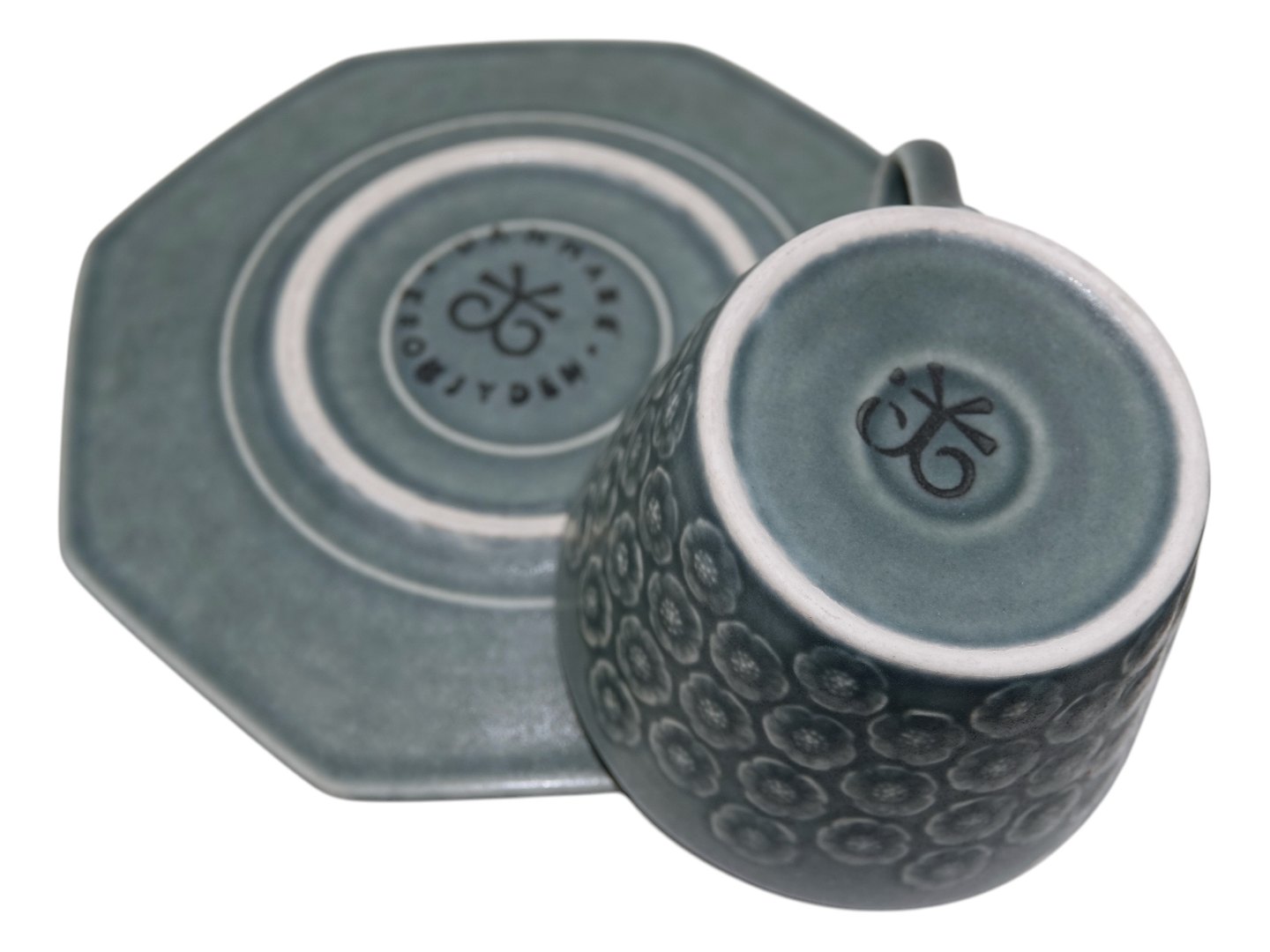 Kronjyden, Azur stentøj, tekop med tilhørende underkop. Designet af Jens Harald Quistgaard. Diameter på koppen er 8,7 cm. Der er en del misfarvninger/krakkeleringer i glasuren ellers fejlfrie.