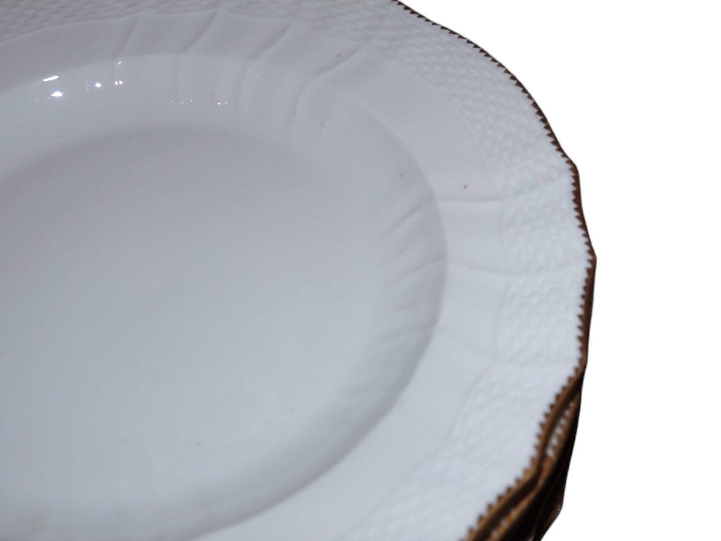 Royal Copenhagen Hvid Svejfet med takket guldkant (også kaldet Guld Takket), middagstallerken. Dekorationsnummer 387/1621. Diameter 24,7 cm. Der er let slid på guldkanten ellers perfekt stand uden fejl.