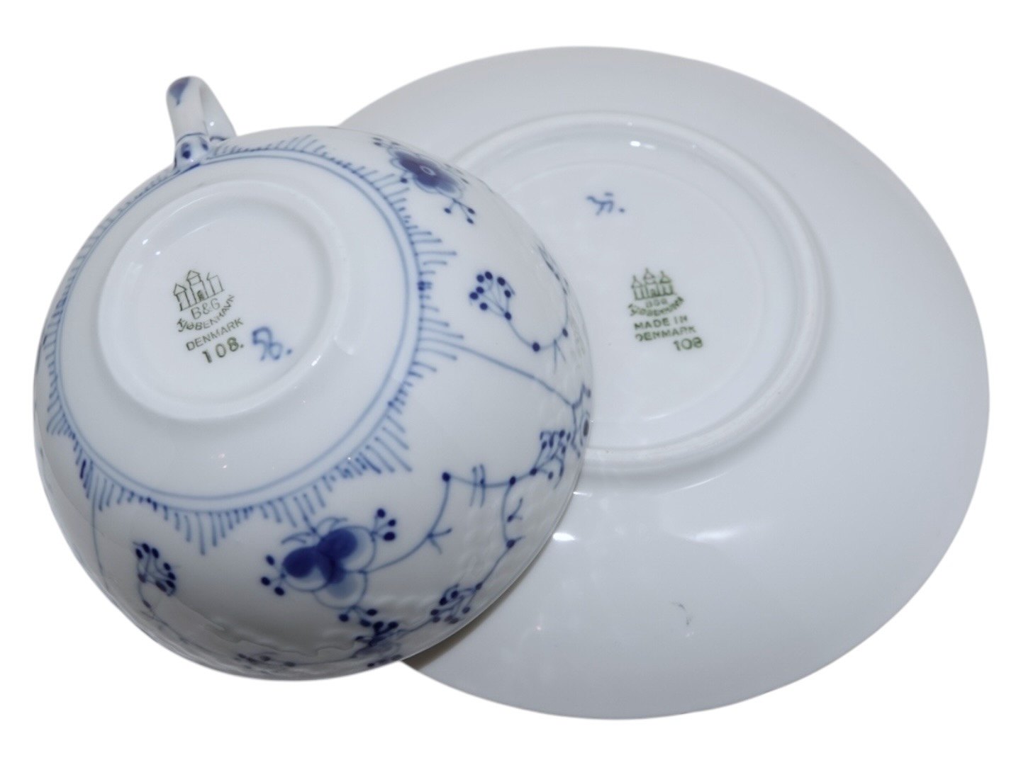 Bing & Grøndahl Blåmalet (Musselmalet), tekop med tilhørende underkop. Dekorationsnummer 108. Koppens diameter er 10,0 cm. Perfekt stand uden fejl.
