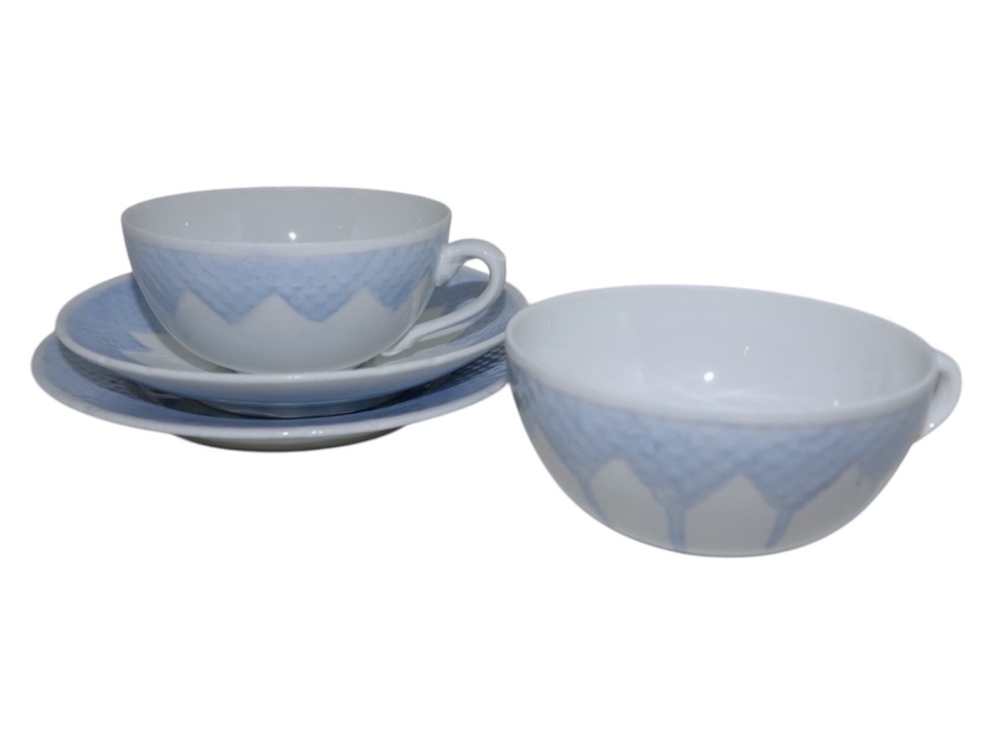 Bing & Grøndahl lyseblåt sæt med to tekopper, en underkop og en kagetallerken. Sættet er muligvis hjemmemalet.