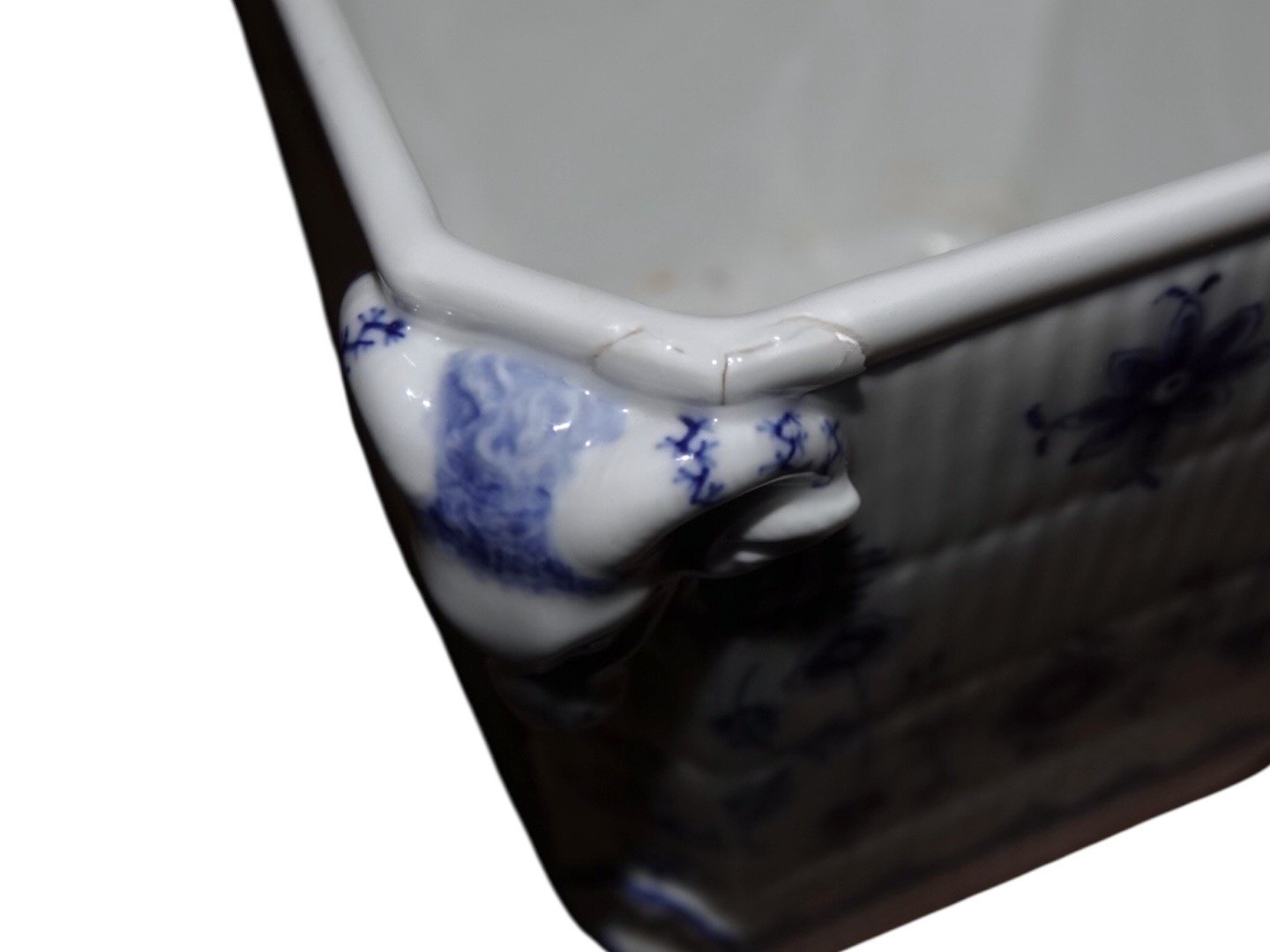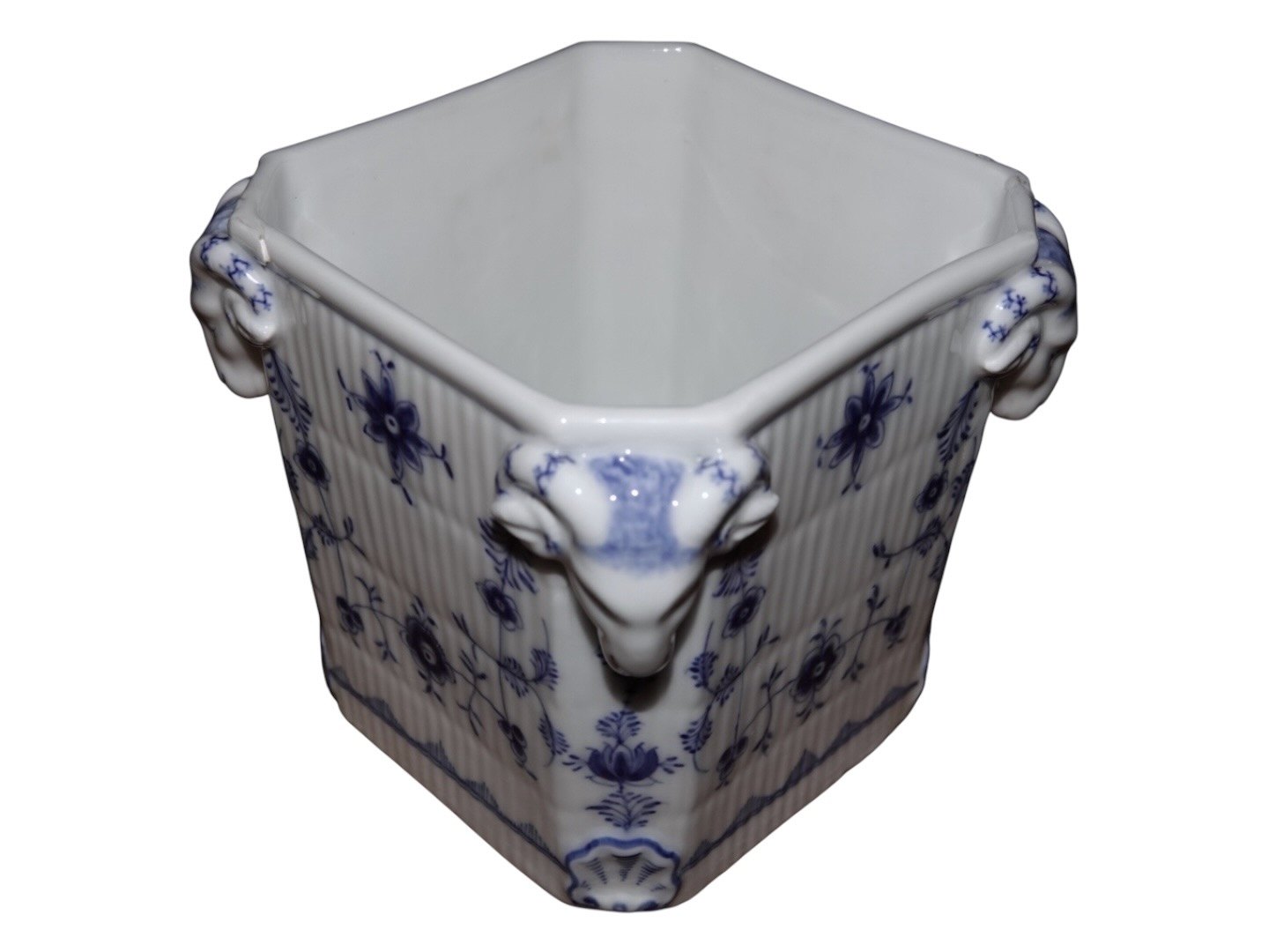Royal Copenhagen Musselmalet Riflet, sjælden firkantet urtepotte med vædderhoveder på siderne. Den mangler en underskål.