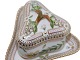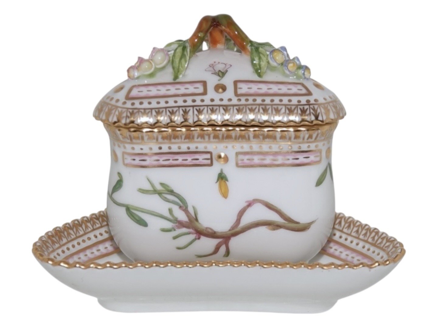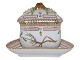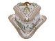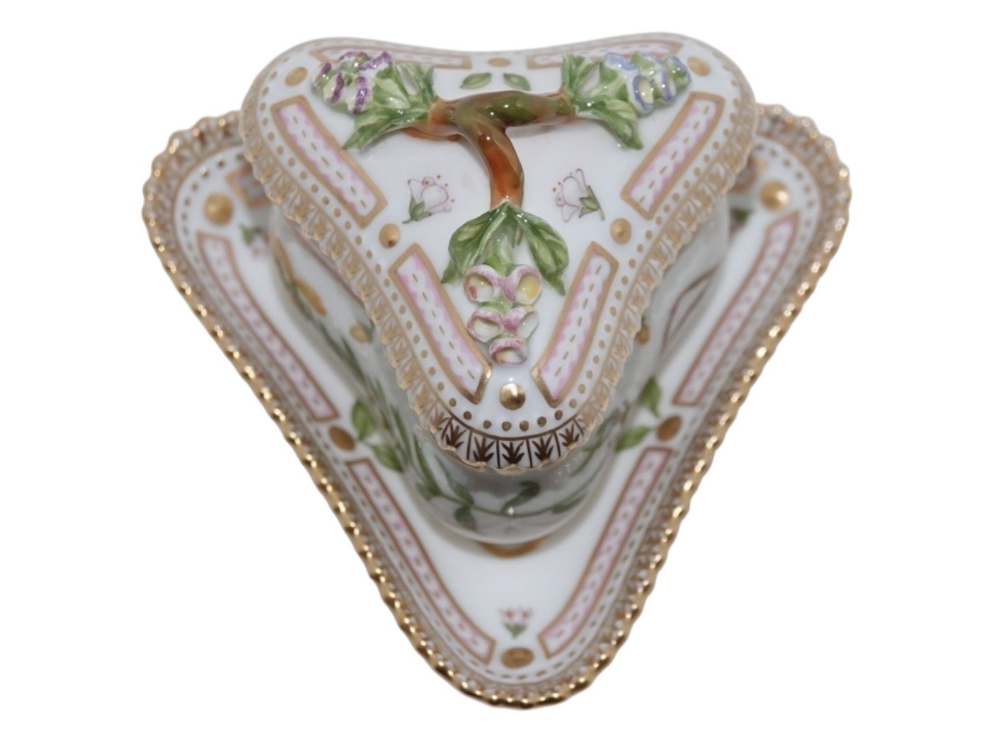 Royal Copenhagen Flora Danica, trekantet cremekop med låg og tilhørende trekantet underkop. Cremekopper bruges til desserter.