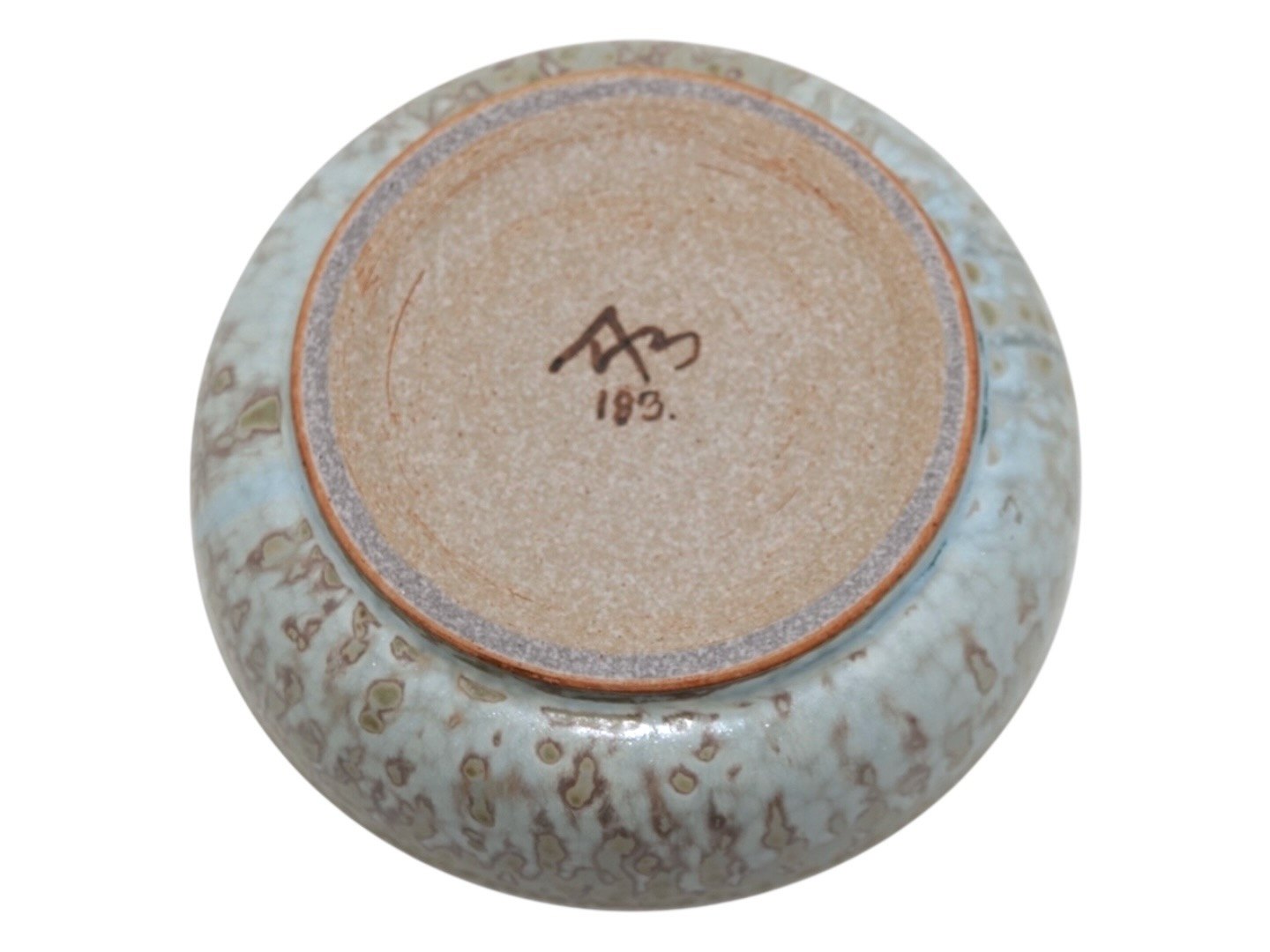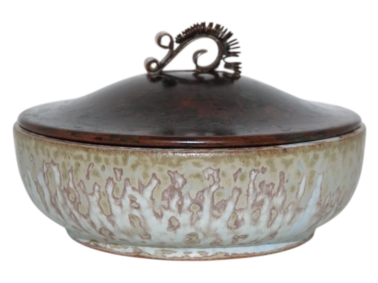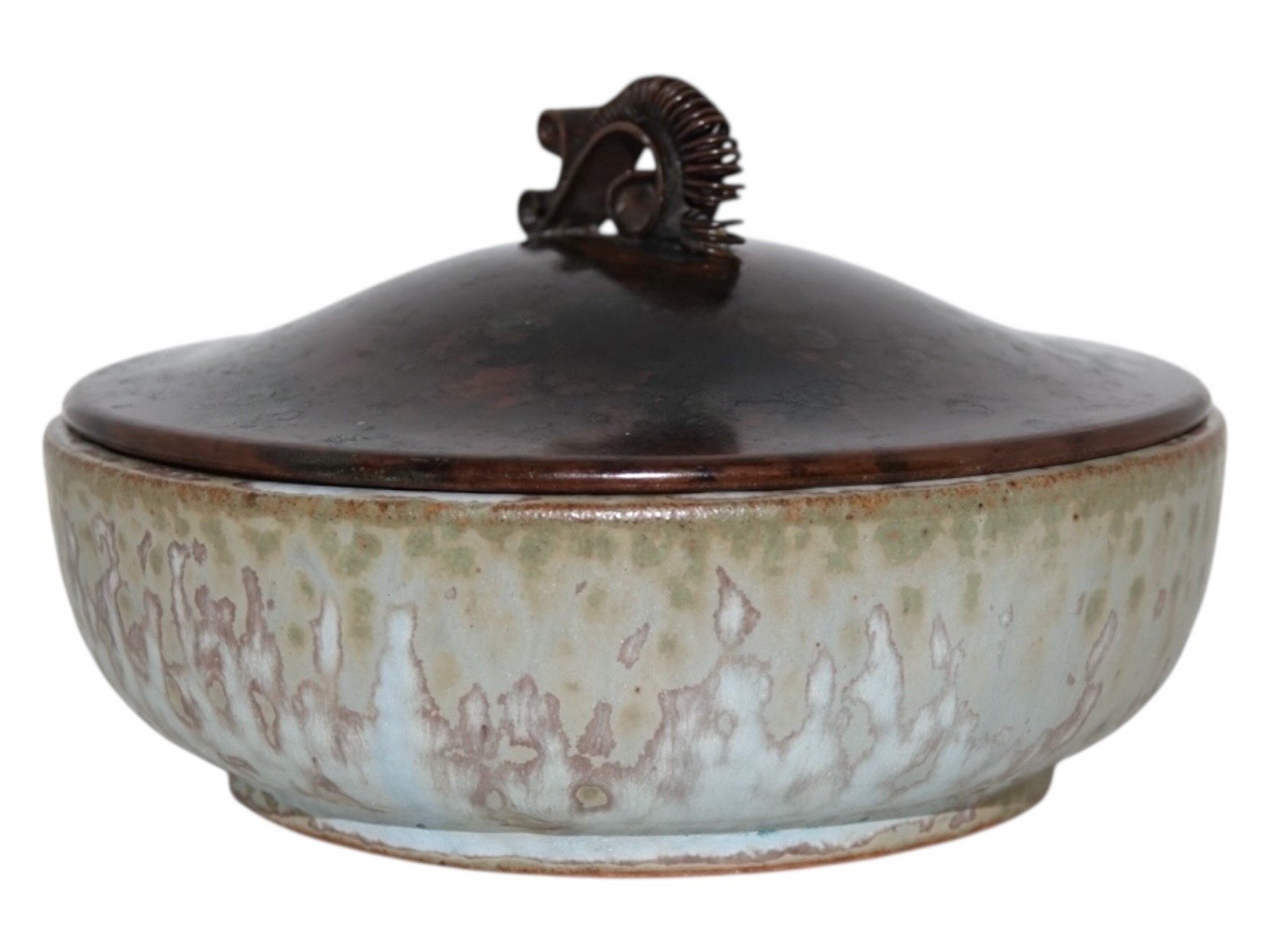 Arne Bang art pottery, bowl with amazing glaze and original bronze lid. Design number 183. Diameter 14.7 cm. Perfect condition.