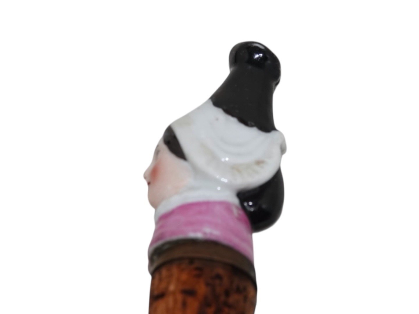 Bottle stopper shaped as a woman from around 1890-1900. Length 8.5 cm. including the cork. There is an old repair/cracks, please see the pictures.