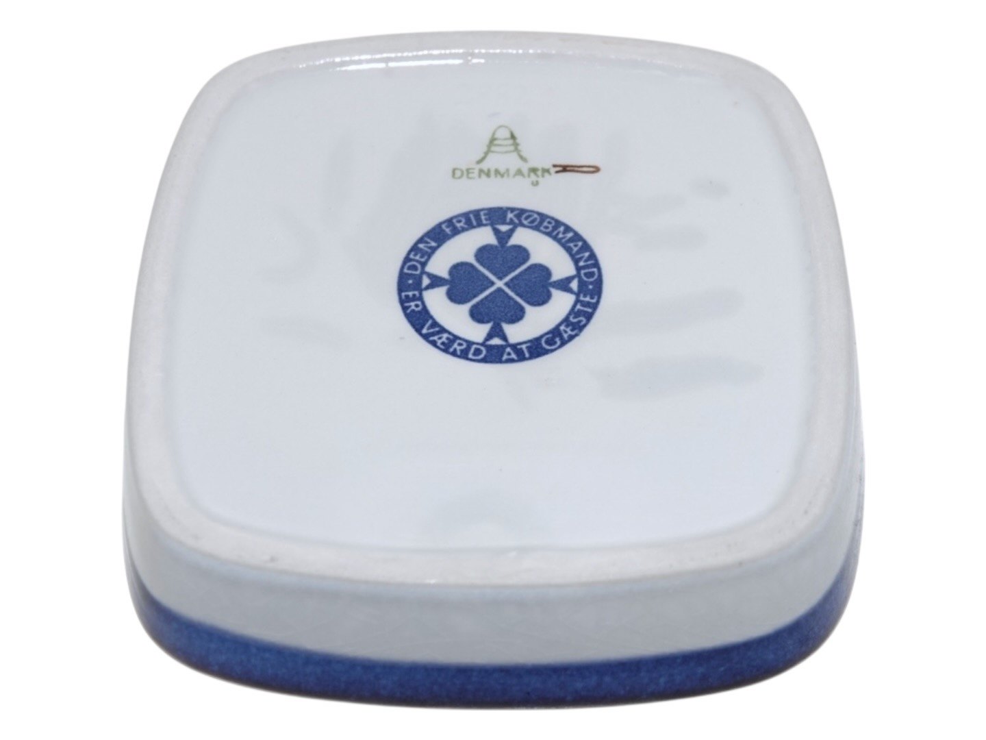 Royal Copenhagen Baca, lille blå firkantet skål med teksten bagpå: Den Frie Købmand er værd at gæste.