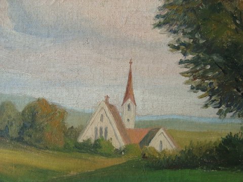 Høstlandskab med tysk landsby med kirke i baggrunden 1921.