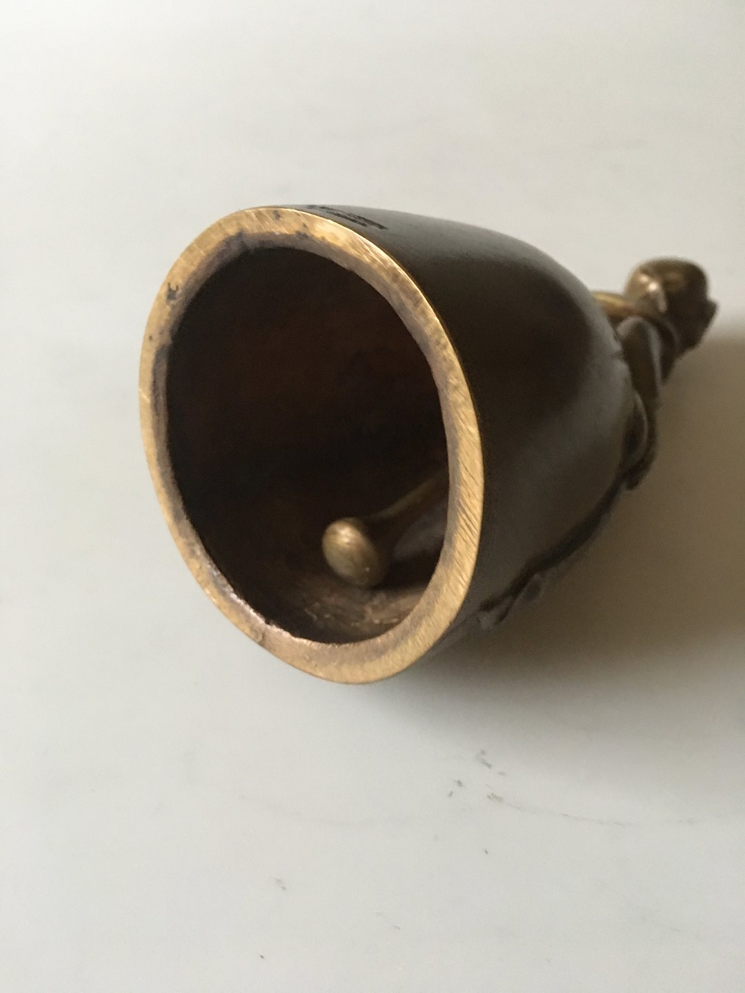 Arno Malinowski Bronze Bordklokke fra L. Rasmussen Bronze Støberi, København. I perfekt stand. Man holder i hoved, som kan vippe. Måler 14cm høj.