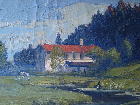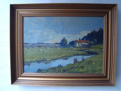 Maleri af Gustav P. Rimmer - Åløb med græssende kvier på marker - 1927.